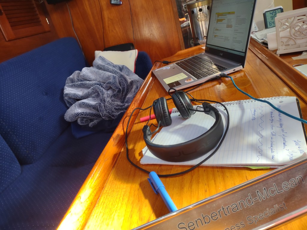Working remotely during a pandemic helped me prepare to be a team member on a virtual IB visit today. I’ve learned that to really be ready I have to get work clothes and makeup on. I have to prepare my area the way I would from my office: laptop, pens, notepad, and sticky notes at hand. Today I even had the nameplate from my last job on my desk I used headphones so I could focus on the meeting while John motored us to get gasoline for the generator and outboard, as well as diesel for the boat.
