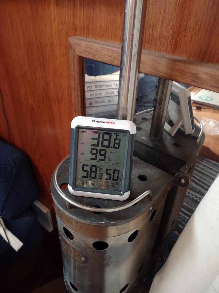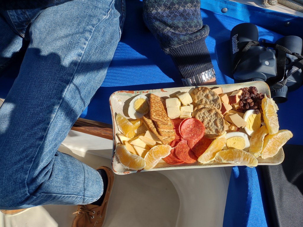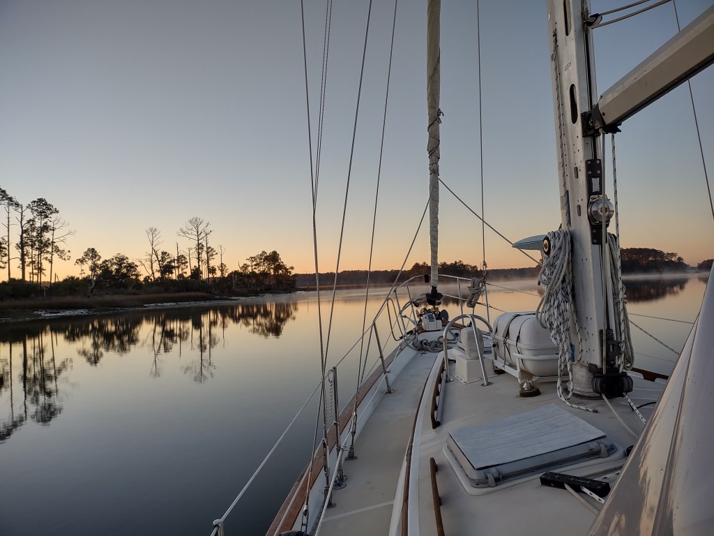 We left the marina during the predawn slack tide; it was dark and really, really cold, with ice on the bow deck. Luckily, John had spoken to a boat owner at the marina yesterday who showed up at 6:00 am to assist us. Condensation on the isinglass of our cockpit enclosure made navigation even more difficult, so we had to unzip what we could…for a short time I stood on the companionway steps holding the front portion up so John could see.