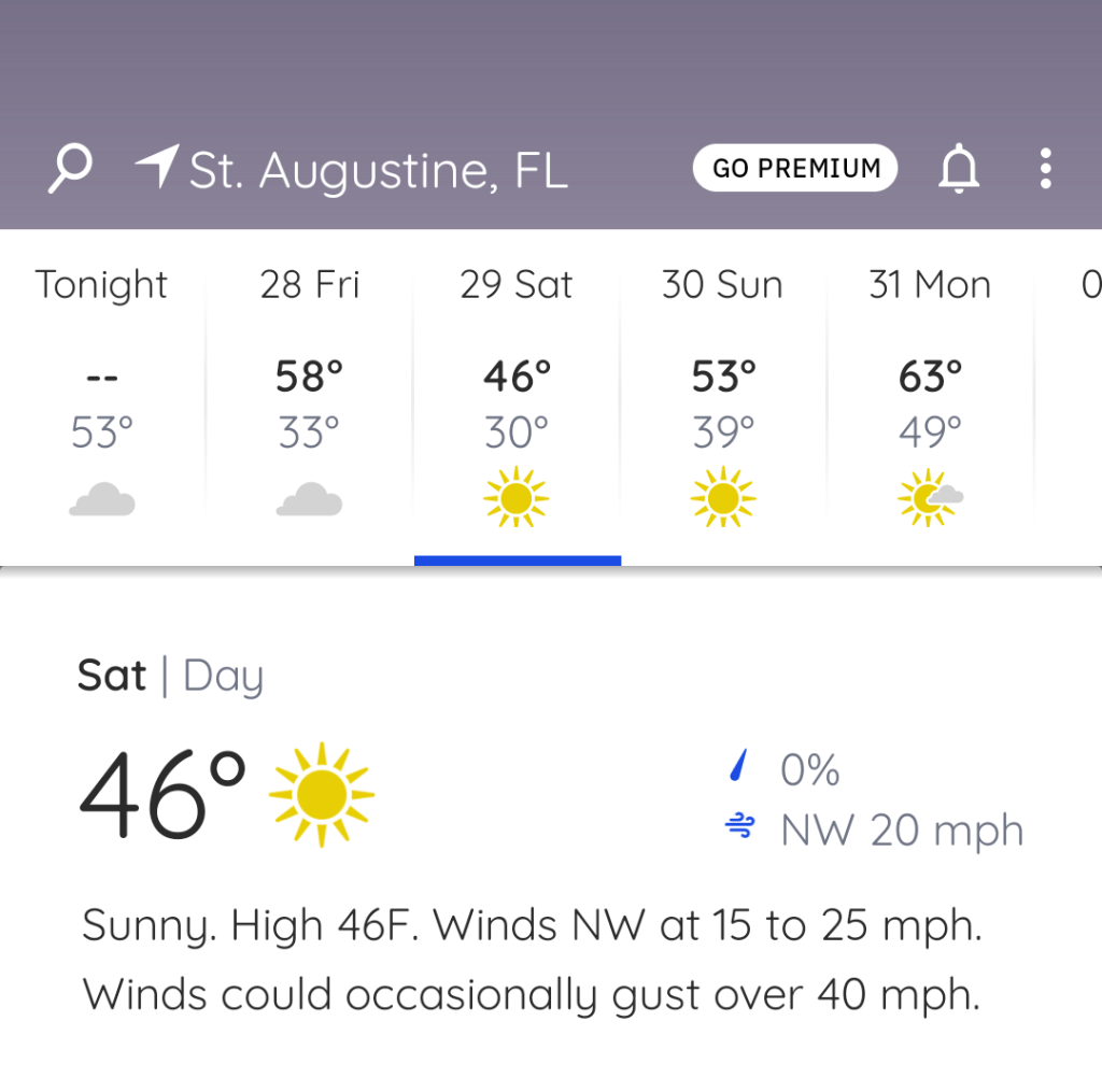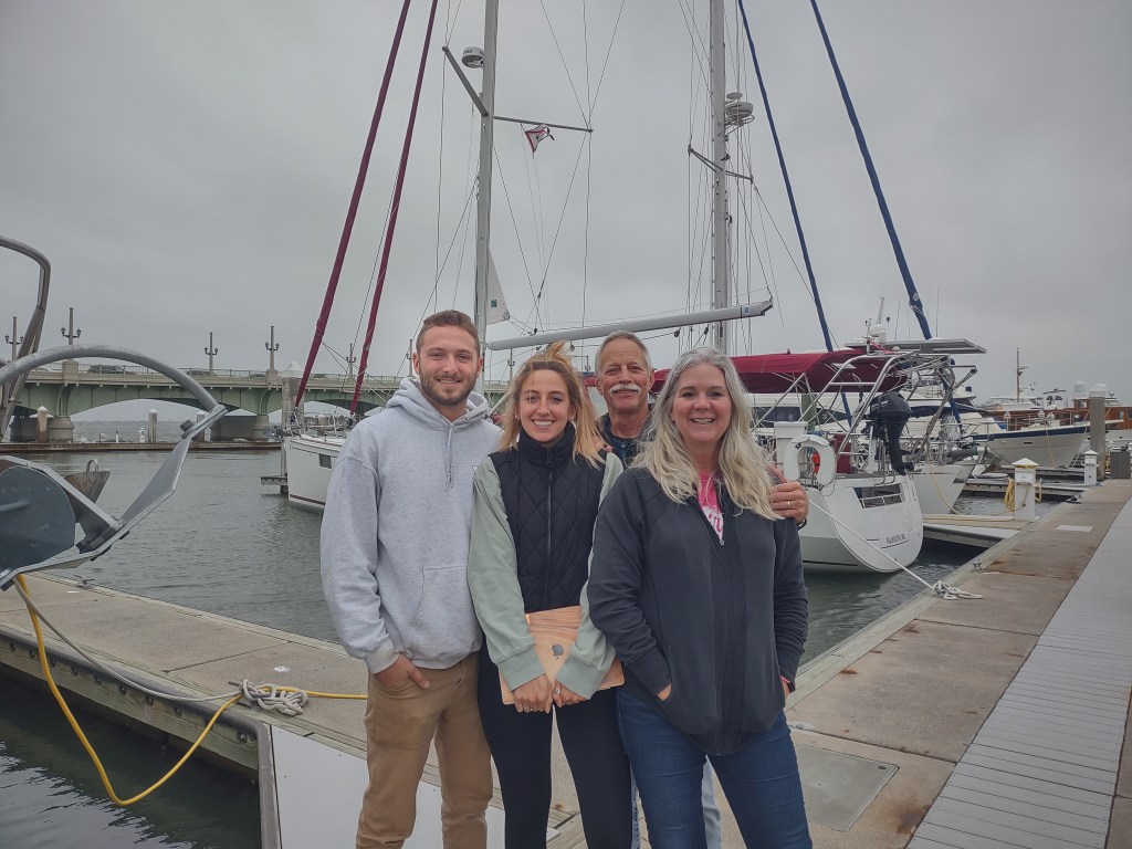 Ugh. It’s cloudy and windy here in St. Augustine. Our slip in the marina is fairly well protected by a break water- we can see the spray as it hits the wall. We have some movement in this slip but it’s not awful (look at the difference between the surfaces on each side of the wall in the video).