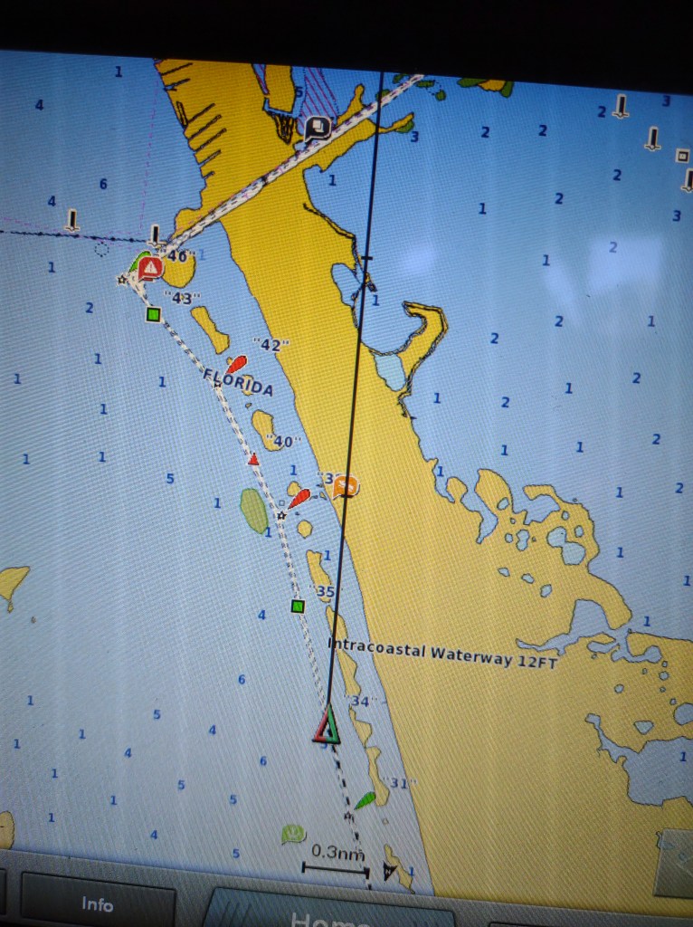 The map below shows how we have to cut through this little canal as the ICW takes a cool turn from the Mosquito Lagoon to Indian River. The map also shows how narrow the ICW is – we follow that white line to make sure we have enough depth. The green squares and red “accent marks” are the markers we use to navigate. (The triangle on the map below is Lailia).
