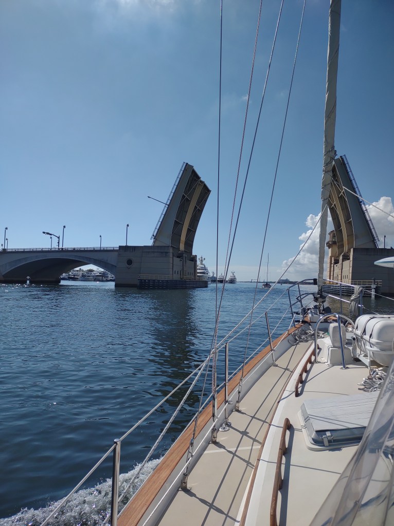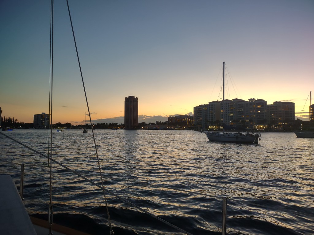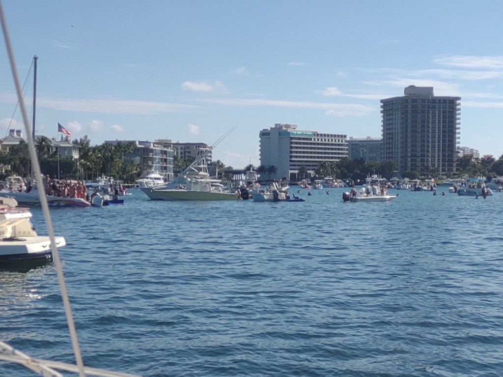 Lake Boca Raton is a really wide spot on the ICW. On a beautiful Saturday (like today) it’s filled with all kinds of partying people on boats. There’s music blaring, people in the water, boats rafted up on each other.. as the day progresses the day-boaters start heading out. But until they do, it’s a huge outdoor party.