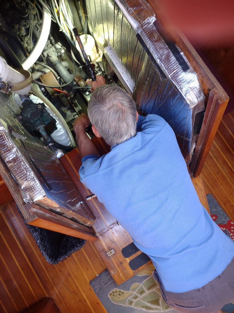 Today was a work day: I had three separate Zoom meetings and John did some preventative maintenance by cleaning the raw water strainer. The raw water strainer helps keep the engine from overheating but it can clogged by all the stuff in the water. In order to access it, John had to remove the ladder and the counter area under it. Because Lailia makes us work to keep her healthy, John had to do this work on his hands and knees.