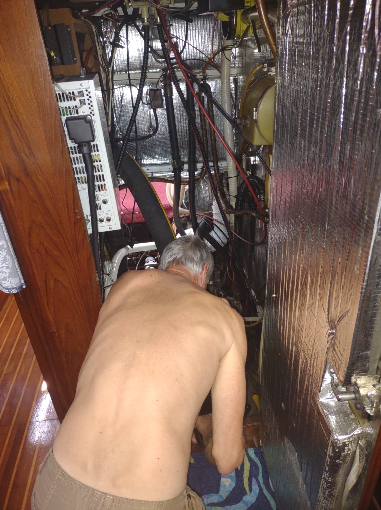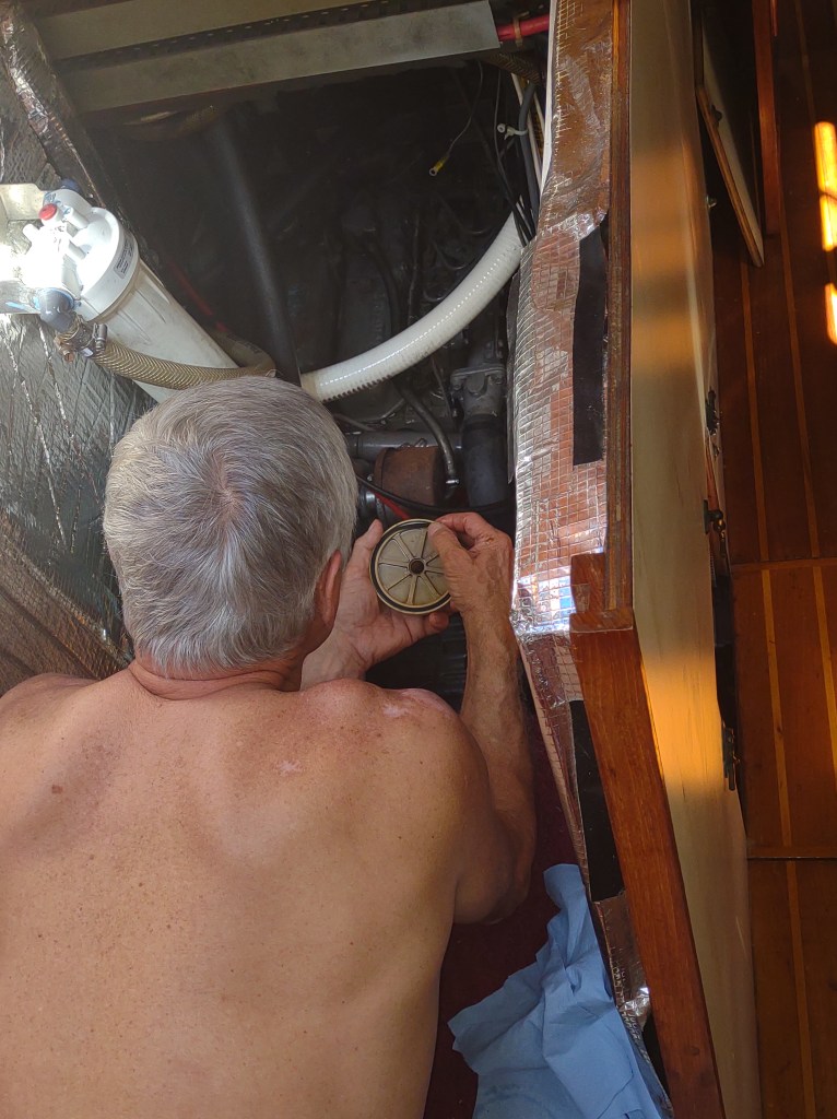 John changed both fuel filters today. It makes sense to get this done before we make the jump to the Bahamas. Of course access to complete this task requires removing the steps and laying on the sole of the boat and kneeling into the engine room on the other side. John is so very mechanically inclined.