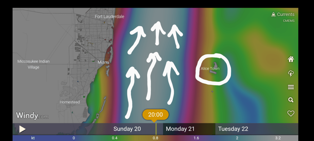 Bimini is almost directly east of Miami but since the Gulf Stream will push us north, we will leave from further south. The Gulf Stream moves north at about 2.5 miles an hour- Lailia comfortably motors at about 6 miles an hour, so for every hour we are in the stream, we will move (approximately) 6 miles east and 2.5 miles north.