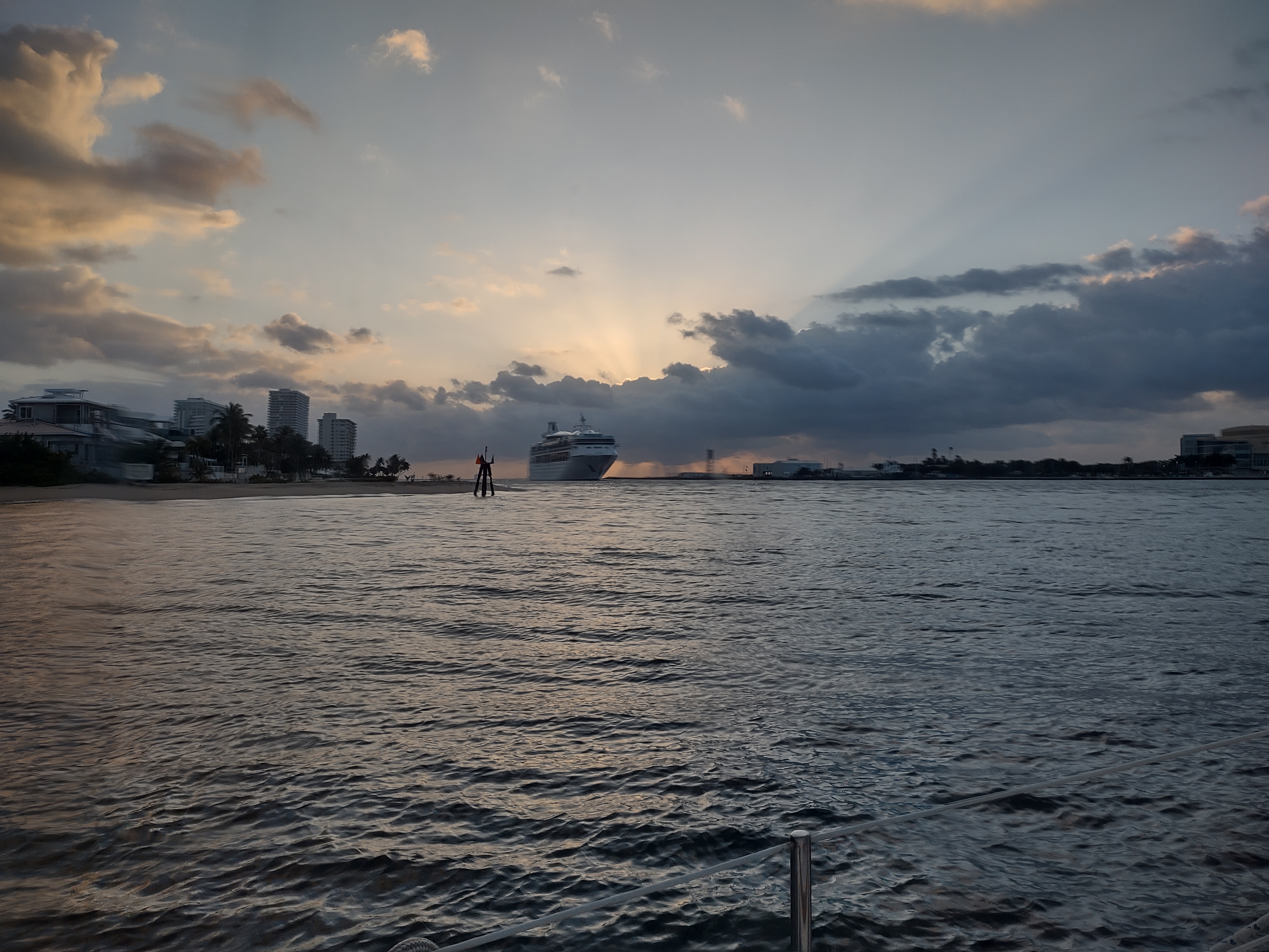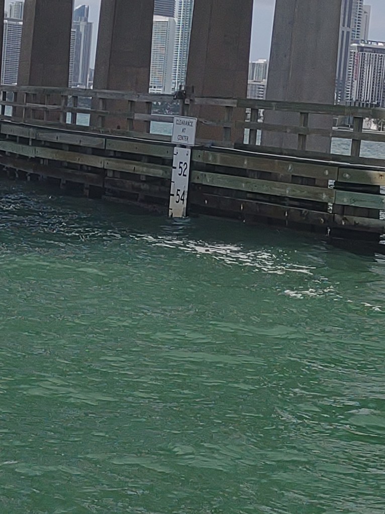 Most fixed bridges (the ones that don’t open) on the ICW have at least 65 feet of clearance from the waterline. Lailia’s air draft – the height of the top of our mast and antennae – is 53ish feet. While it always seems like we’re not going to clear, we have a good 10+ feet of clearance for most fixed bridges –HOWEVER the Julia Tuttle Bridge on the ICW in Miami has a fixed height of 56 feet. A lot of boats “go outside” to avoid this bridge: they head out to the ocean at Port Everglades and come back in at Port of Miami. We decided that the ocean was a bit too rough so we went the Tuttle Bridge route. Knowing how close we were – and knowing that there were some waves that might push us up a few more feet was nerve-wracking.