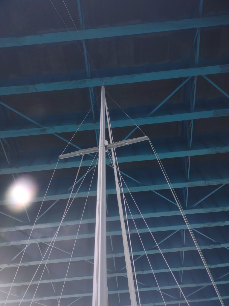 Most bridges have tide boards that show how much air draft is available. They’re usually written in really large numbers that are easy to read from a good distance. For whatever reason, the Tuttle Bridge numbers were difficult to read until we were right up on them.
