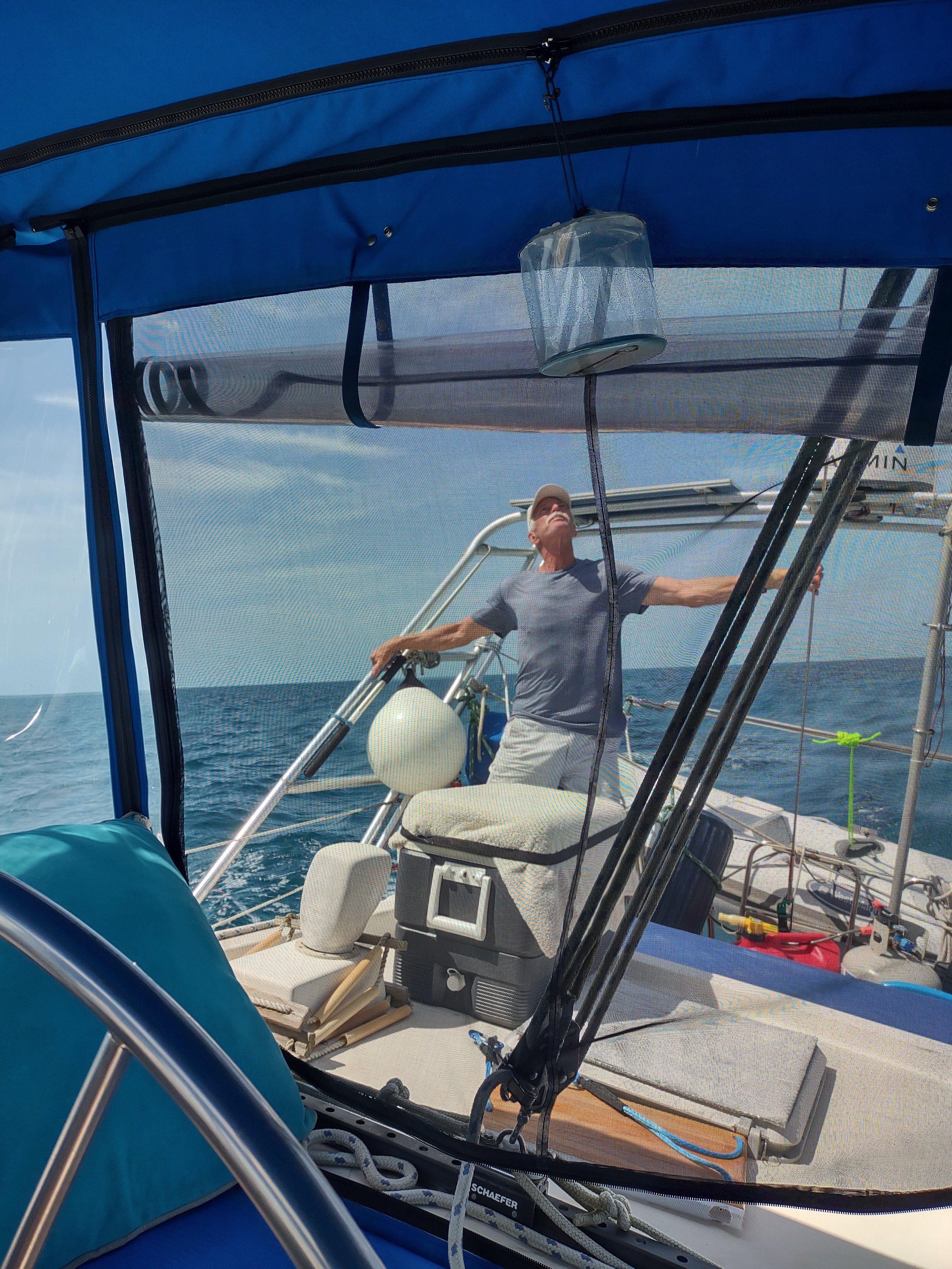 The waves were not as small and slow as I hoped when we turned. It’s not that it’s really scary – Lailia is a really sturdy boat – it’s that invariably something needs to be done down below: a bathroom run, John needs a thing, or I hear something fall. Navigating the companionway ladder while we’re bouncing isn’t easy.