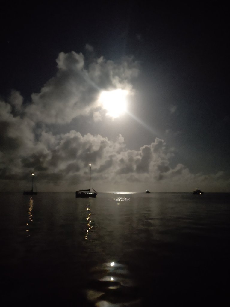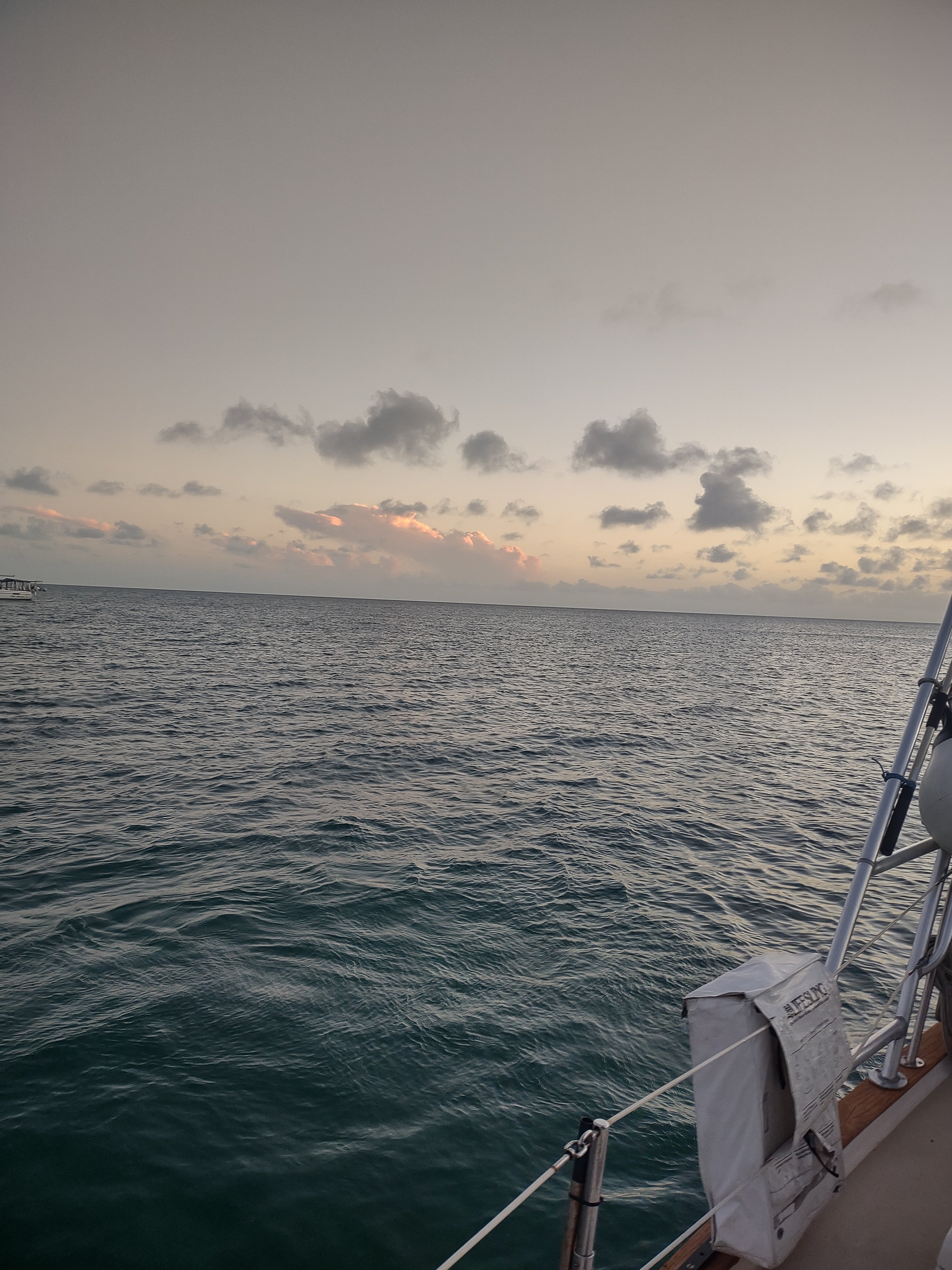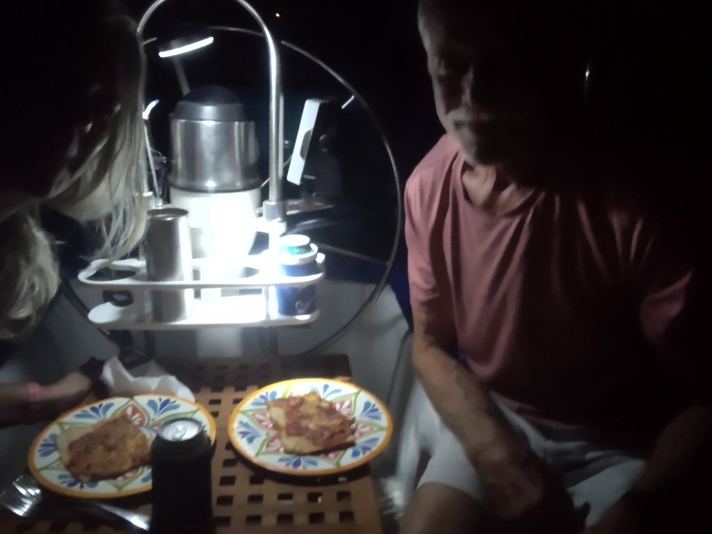 Being docked has a lot of conveniences: stability, electric and most of all, being able to get on and off the boat whenever we desire. When we’re anchored we have to physically lower our dinghy from the davit with a series of pulleys. For safety as we crossed, we (mostly John, but I did haul it up) moved the dinghy motor from the dinghy itself onto a board mounted on our stern rail. This is a far more stable platform than a swinging dinghy (swinghy?) when we have rolly or crashing waves..