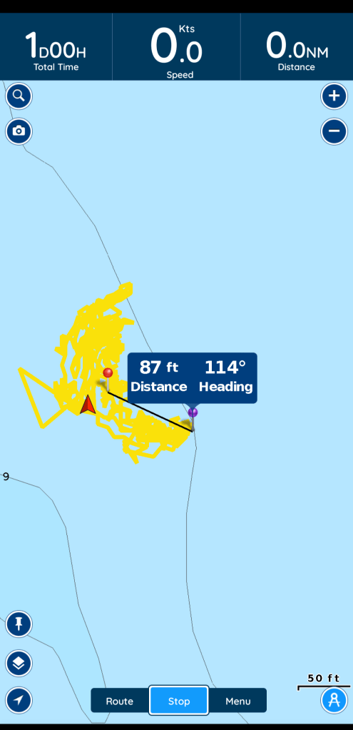 We move a lot on anchor. Because I worry about stuff like this, I not only have an anchor alarm but I also track our movement over time. This reassures me that we aren’t floating anchorless. This isn’t perfect – the tracker is phone-based so it shows me moving my phone in the boat, but I do like seeing that we pretty much move in a nice arc off where we dropped our anchor