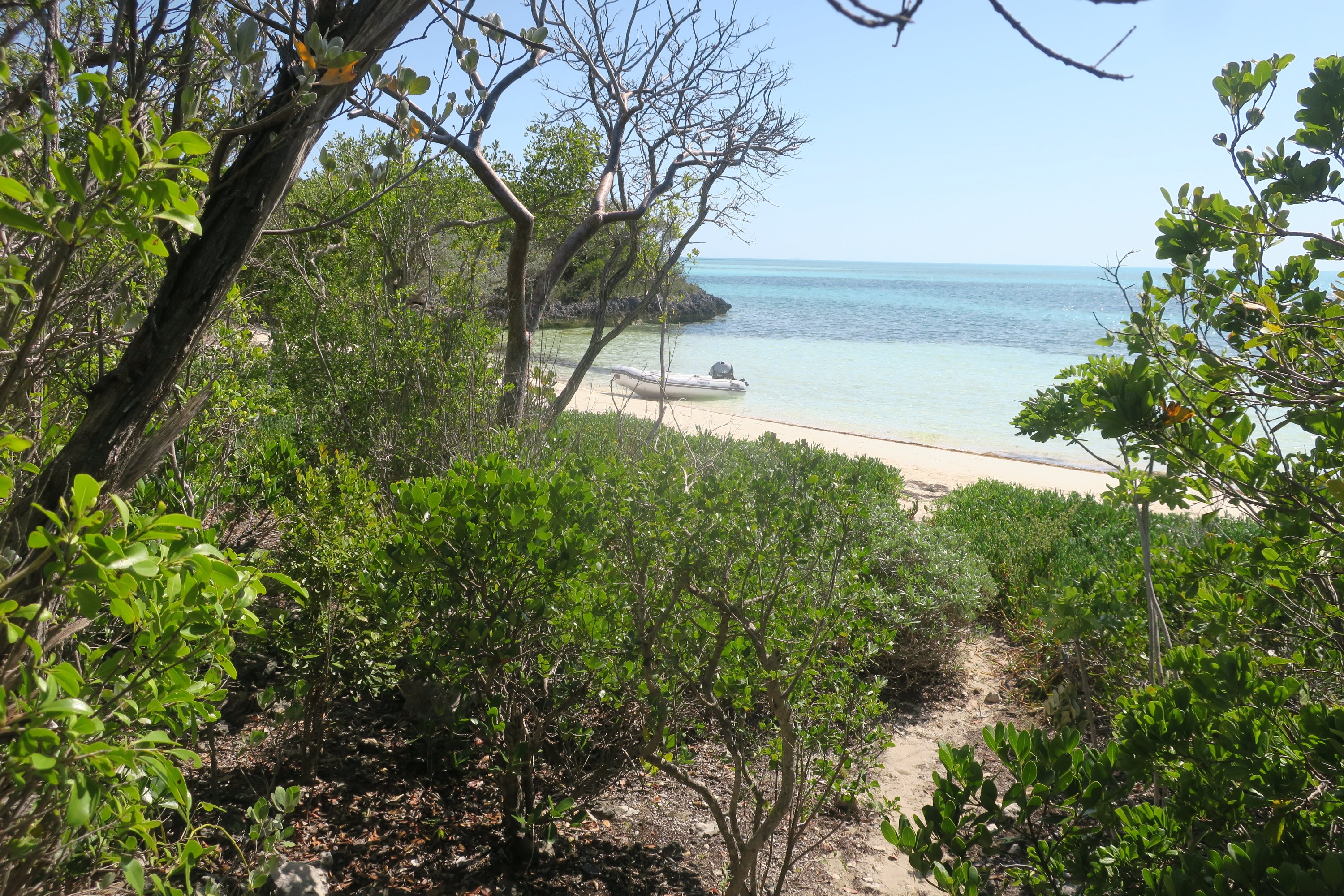We quickly took our dinghy over to the beach where we thought the trail to the blue hole was. We tied our line to a rock and took the narrow path through the brush.