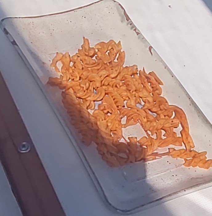When we’re anchored we often have an afternoon cheese plate: a few types of cheese, some crackers, and some fruit or vegetables. Today we were able to add some honey barbecue Fritos to the mix. Neither of us would have bought these in the past but…you take what you can get when you’re in the Exumas. We even had seconds!