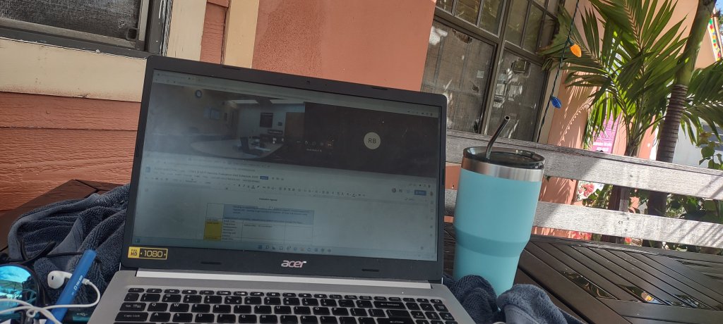 The cafe opens around 9:30 (Bahama time is different) but the patio is open and partially covered by umbrellas. There’s also an electric outlet so I can keep my laptop charged. This morning I shared this space with a couple who were also working remotely. We talked for a bit and I learned that they’re from Charleston county, too.