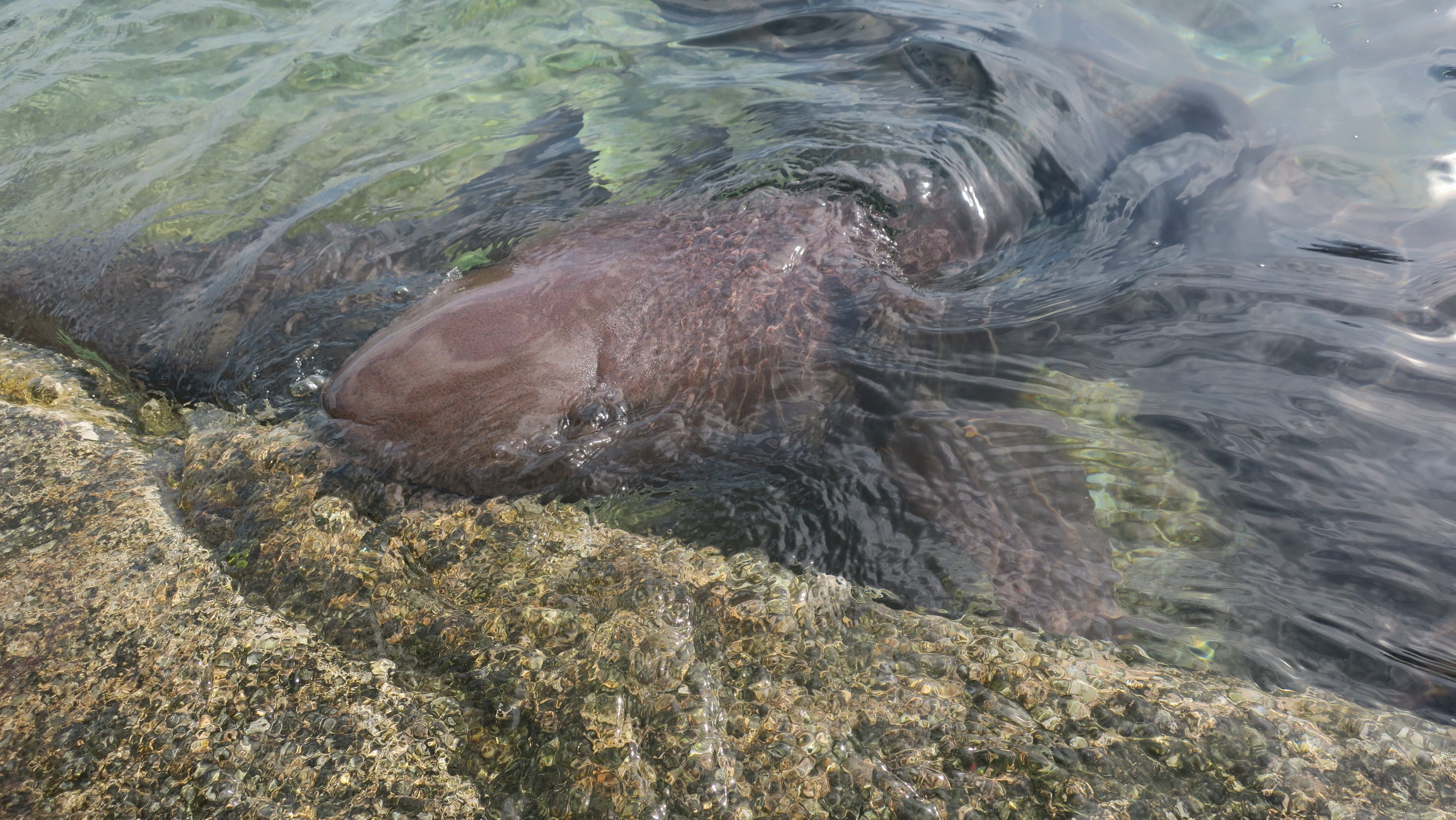 There’s a school of large nurse sharks at the Staniel Cay Marina. They hang out by the fish cleaning station which is also near some concrete steps. Their mouths are closer to that of rays; they don’t have scary teeth (instead of serrated teeth, they have teeth to crush their food) and they have two sensors to help them feel for food on the seabed. This means they are very pet-able.