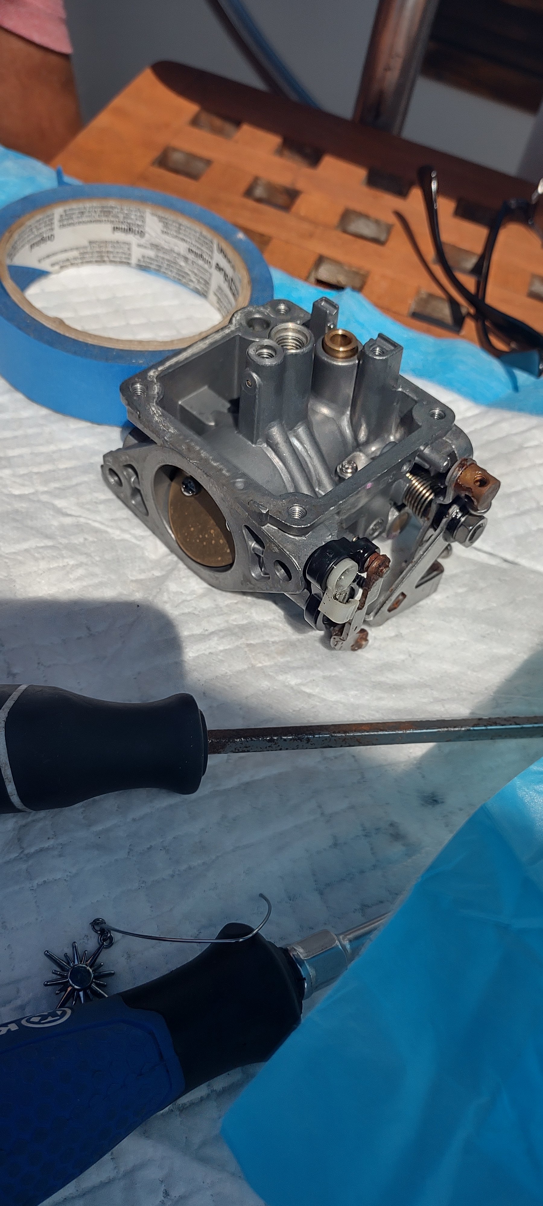 Thanks, sister Tish, for reminding us that necessity is the mother of invention. John did a quick course on carburetor repair via “YouTube University” before using that teeny bag of supplies. One thing that he needed was a very thin, but somewhat rigid piece of wire to clean the jets and ports of the carburetor.
