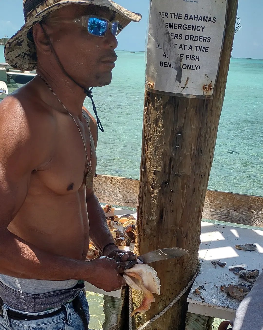 At the yacht club dinghy beach we ran into boat buddies from Great Harbour. A conch boat came in as we were eating our lunch outside. They had already removed the meat from the shells; they were chopping and cleaning the meat. Lots of locals were there – some with bags to get meat and a few grabbing conch “pistols” and eating them right then and there.