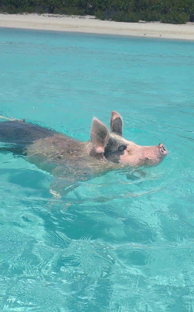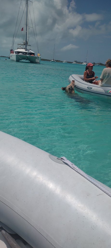 Since we were near Pig Beach, we rode closer folks who were feeding them from their dinghy. I like to see the pigs but don’t want them to get too close to me…I take the warnings about them biting seriously.