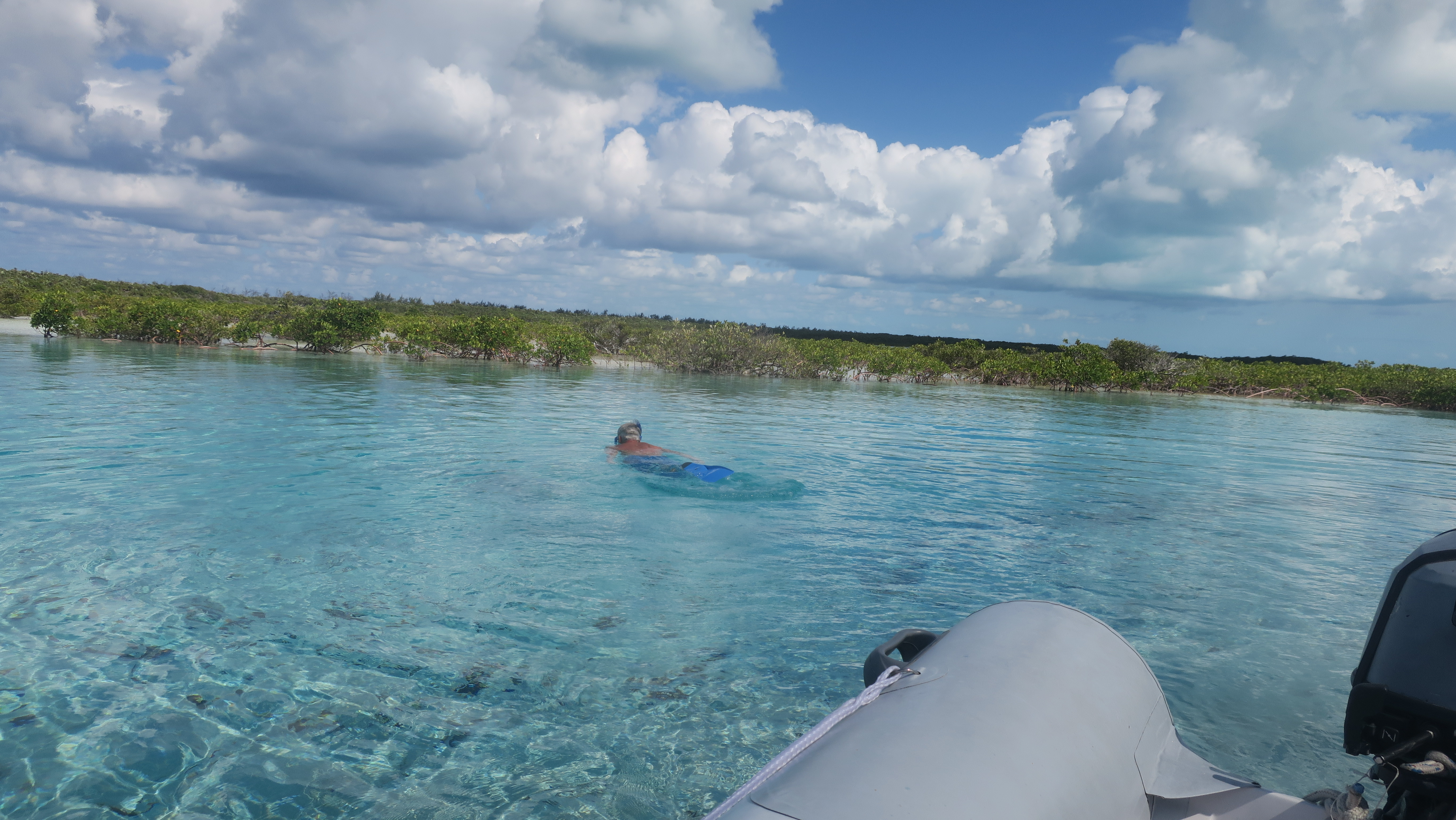 The Exumas Banks are shallow – most of the time the depth is 20 feet or less. The calm water allowed us to see the bottom and it was pretty barren. There were some rocks and few spots with sea grass but there’s a lot of sand. We spotted a few starfish and maybe five fish the entire way. This was not what I thought was happening under the surface.