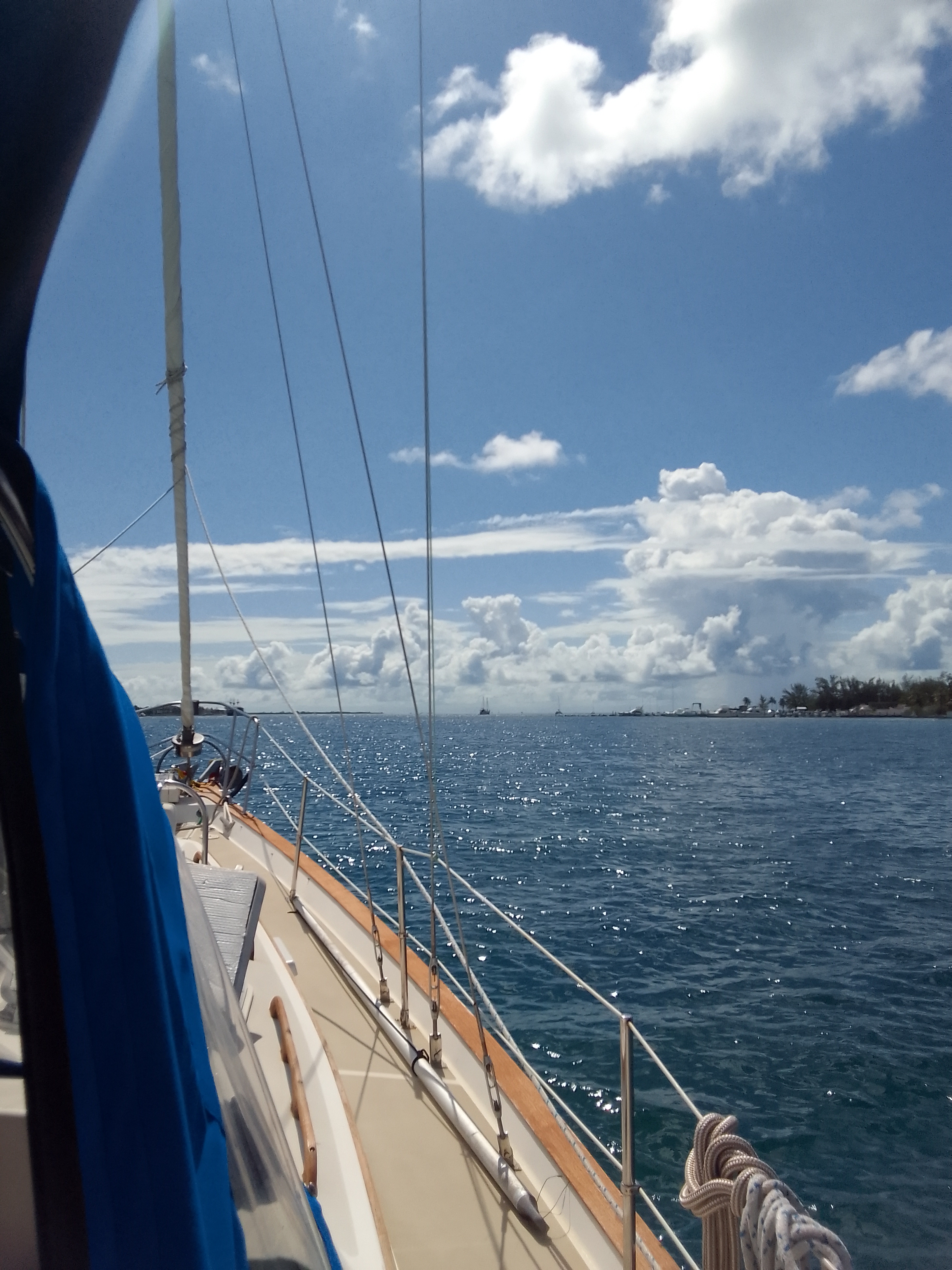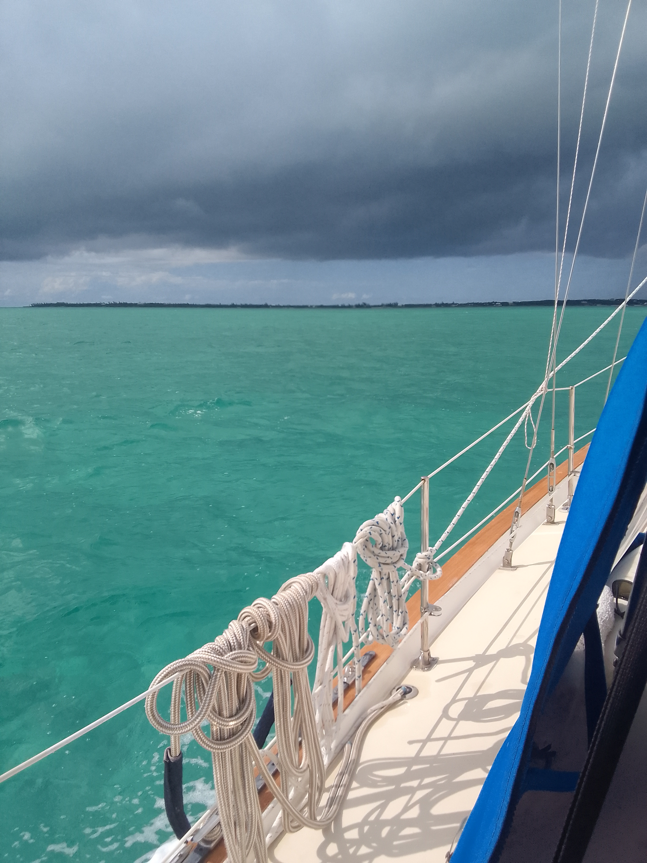 We had rain near us much of the way (or at least I think so – slept a lot). Boating in squally weather with wind and lightning can be stressful but we were lucky: we had some light rain but no strong winds or lightning. We even had some menacing clouds when we were getting close to Spanish Wells – somehow they didn’t impact us at all.