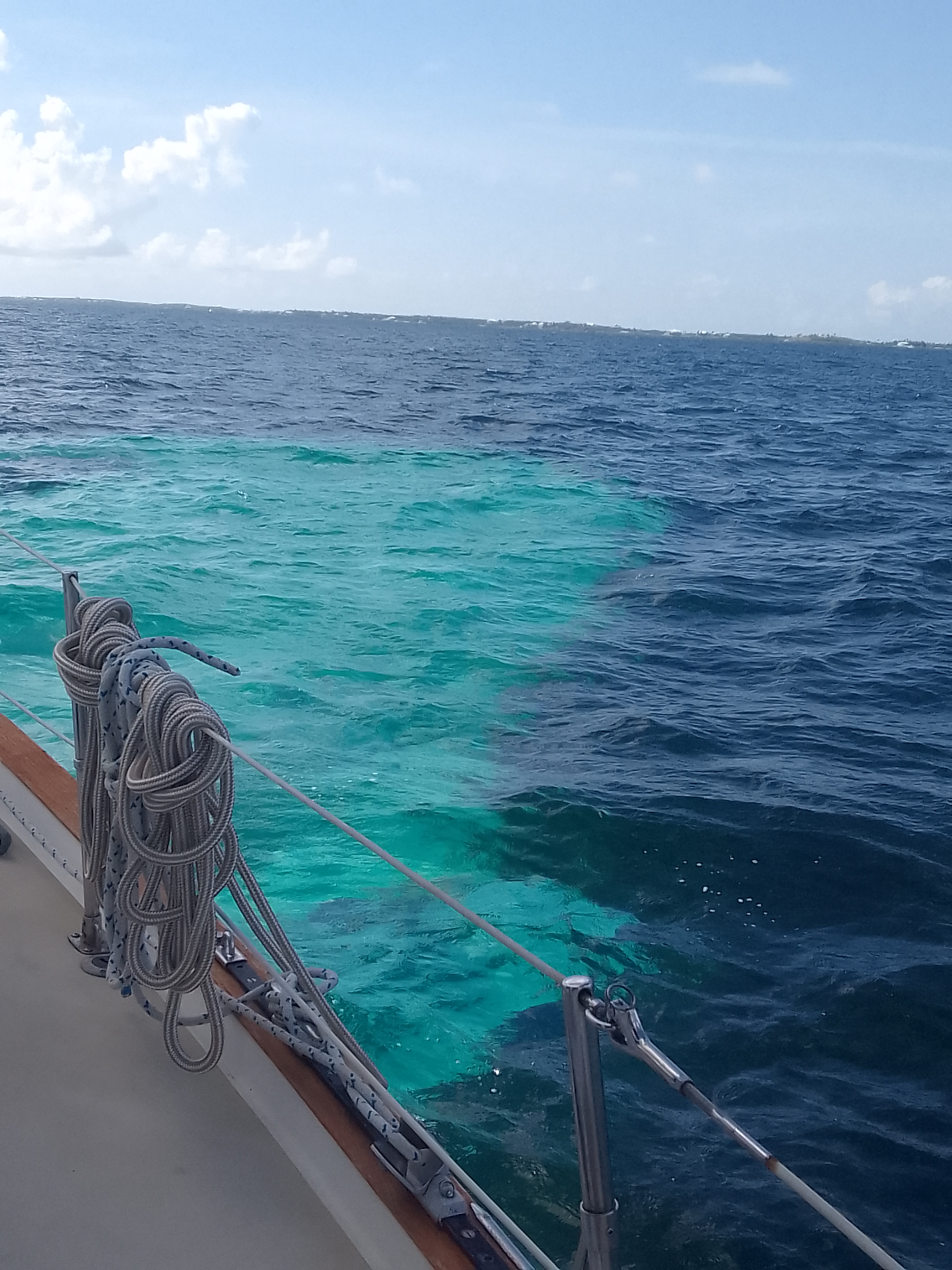 The Garmin and the boat apps give us a lot of information when we are traveling but we also use some visual cues. Turquoise blue water generally means depths of at least 10 feet with a sand bottom. Dark black shapes under the surface can mean rocks. Some dark blue can mean really deep water (like the blue velvet we saw on deep crossings) while other dark blue usually means at least 15 feet of depth and a grassy bottom. It’s pretty cool to see the contrast between sand and grass!