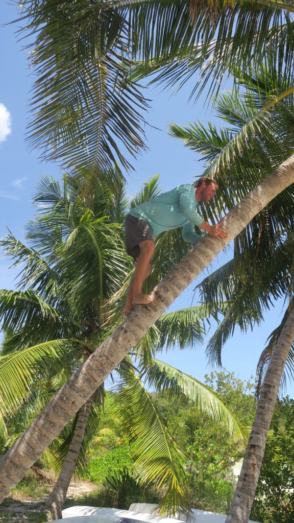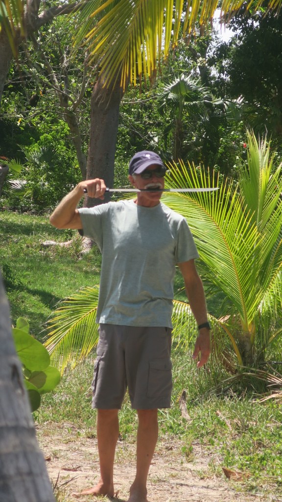 We escaped the art trail mosquitos by hanging out on the beach on the west side of the island. There are a few picnic tables there as well as coconut palms and even a machete. Andy decided we needed coconuts, then the boys used the island machete to open them.