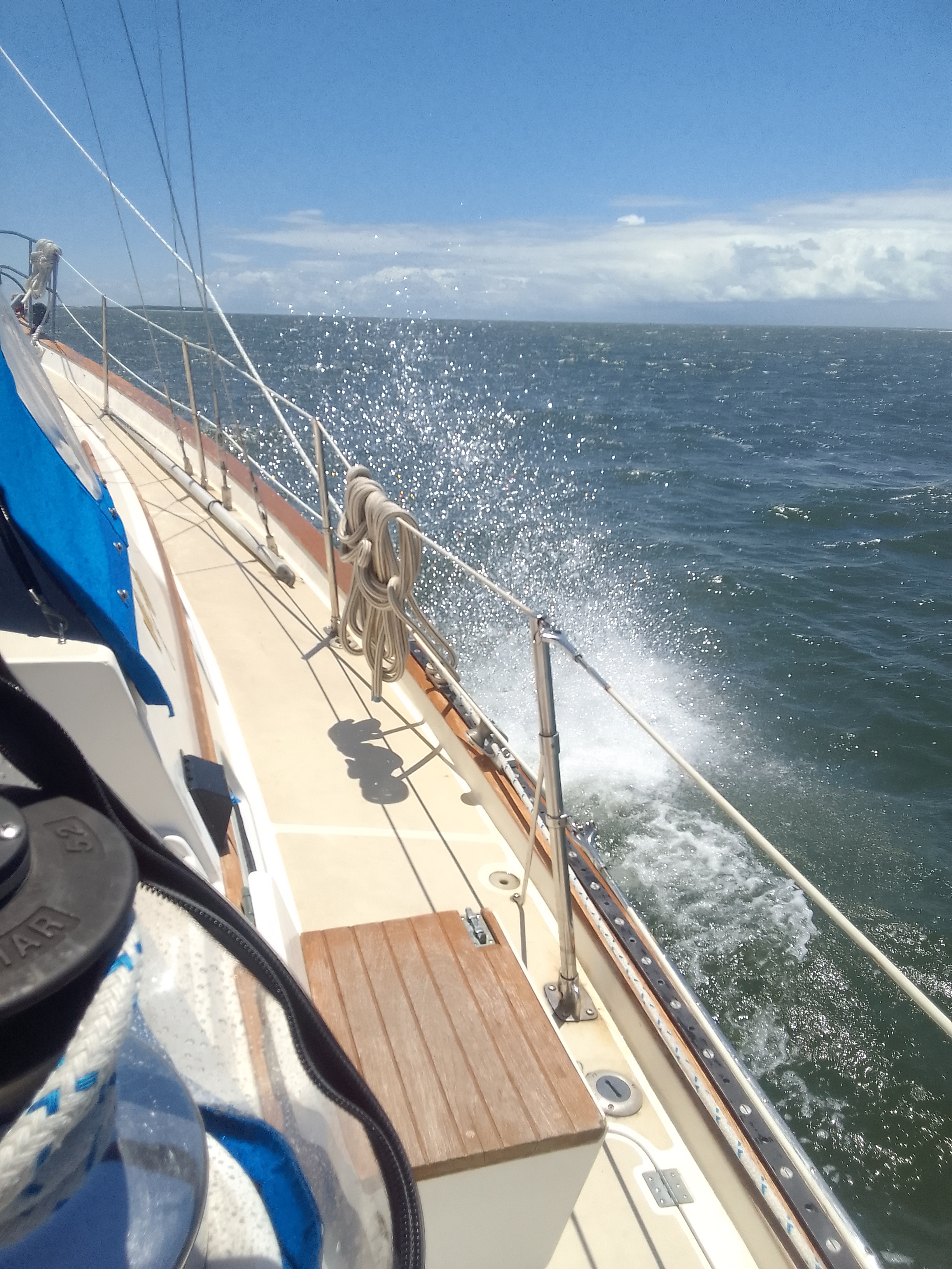 When we headed south in January, the Port Royal Sound was so *sporty* that we turned back. Today it was a rolly enough that we closed the hatches and portlights but it was fun – no one got sick and we made good time.