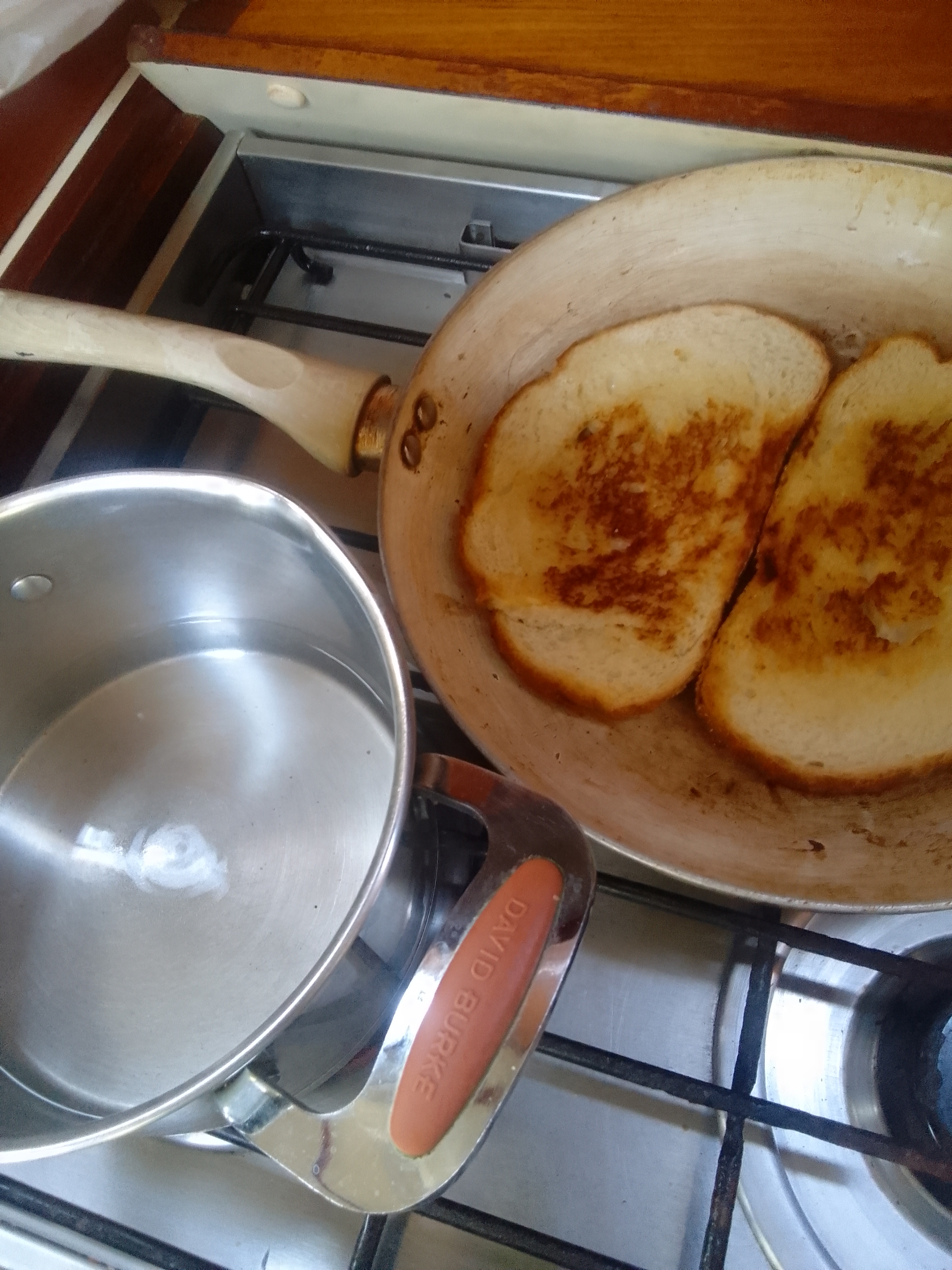 On days we are on the move, breakfast is prepared underway. We don’t have enough power when we are not attached to a dock to use any electric heating devices like toasters or coffee makers, so we’ve figured out some routines that work for us.