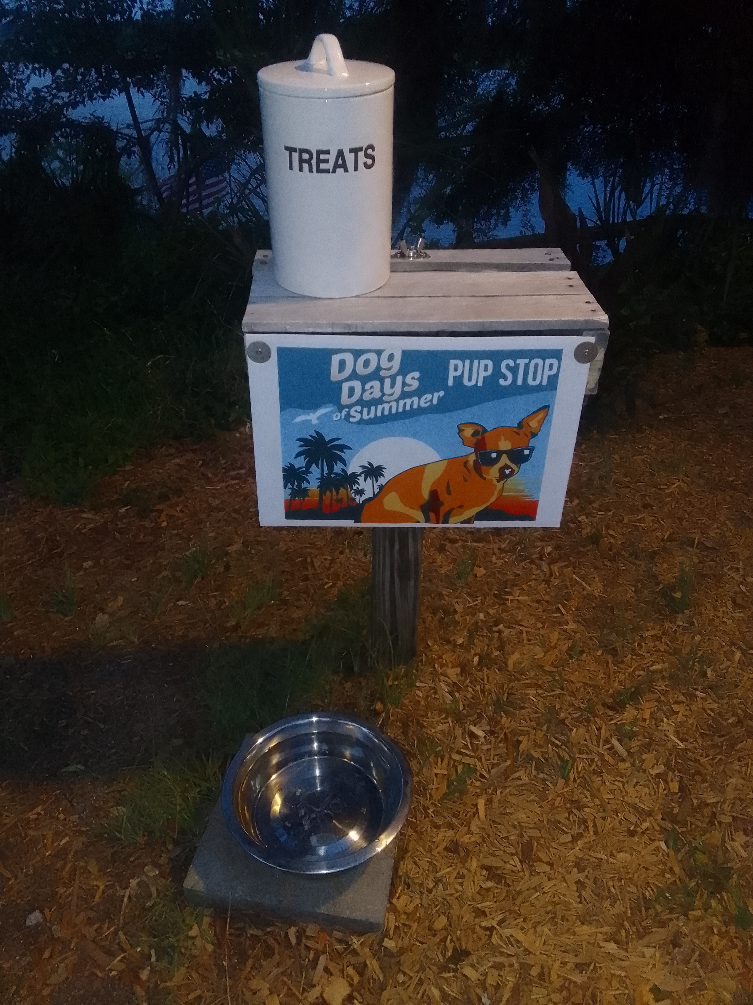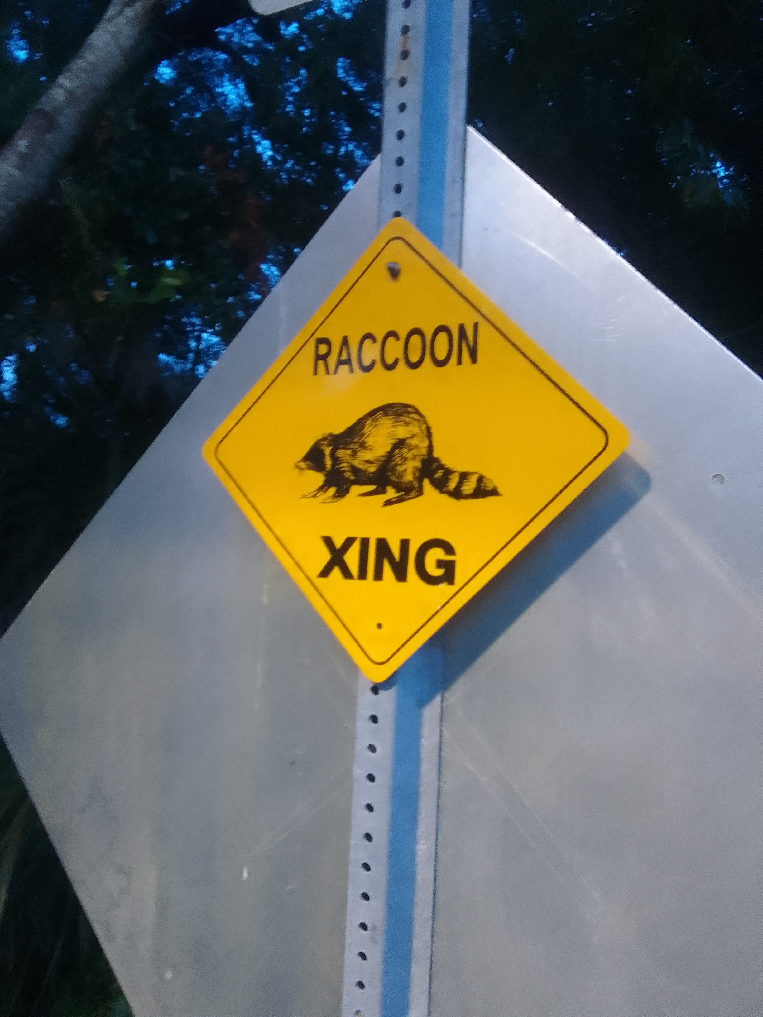 It’s raccoon-friendly, too: the raccoon crossing sign is very close to the dog treats. No doubt the trash pandas are aware of the container of biscuits sitting there.