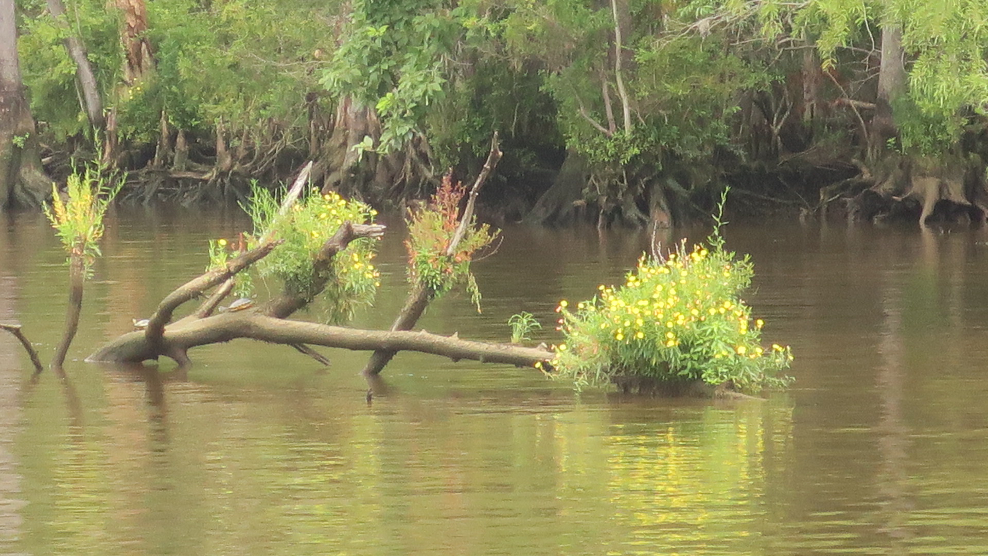 The Waccamaw River section of the ICW is pretty at this time of the year. There are all kinds of trees and flowers that grow in the water, so it’s like traveling through the woods. Because I have a very active imagination, I like to pretend that John and I have gone back in time and are exploring this river as new settlers. This only works on the sections that aren’t filled with speedboats whizzing by us…