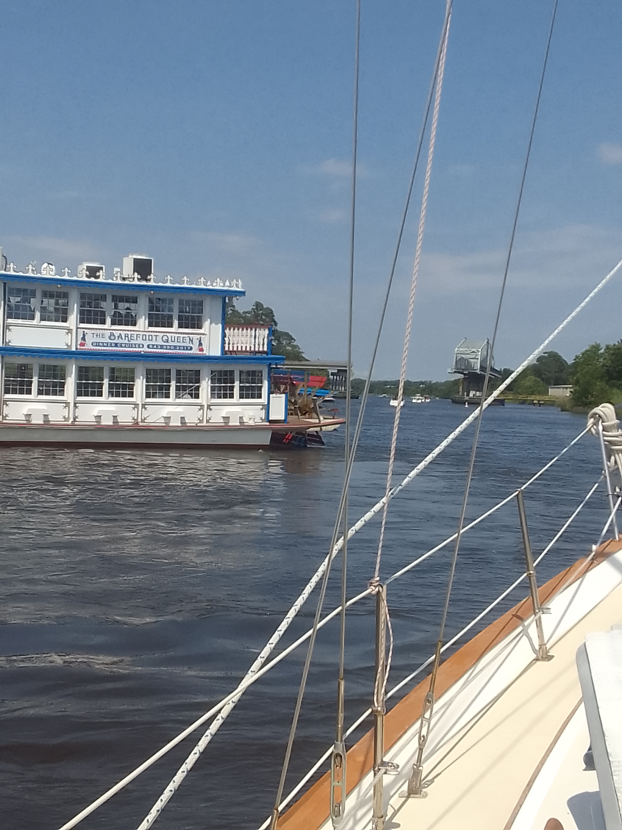 We had been following behind the Barefoot Queen – a faux paddle steamer – for a few miles. As we approached the Barefoot Landing Swing Bridge, we assumed that it was slowing down to await the bridge opening. We were somewhat surprised when it made a sudden turn into a marina on the other side of the ICW. We are guessing that their VHF radio was not working.
