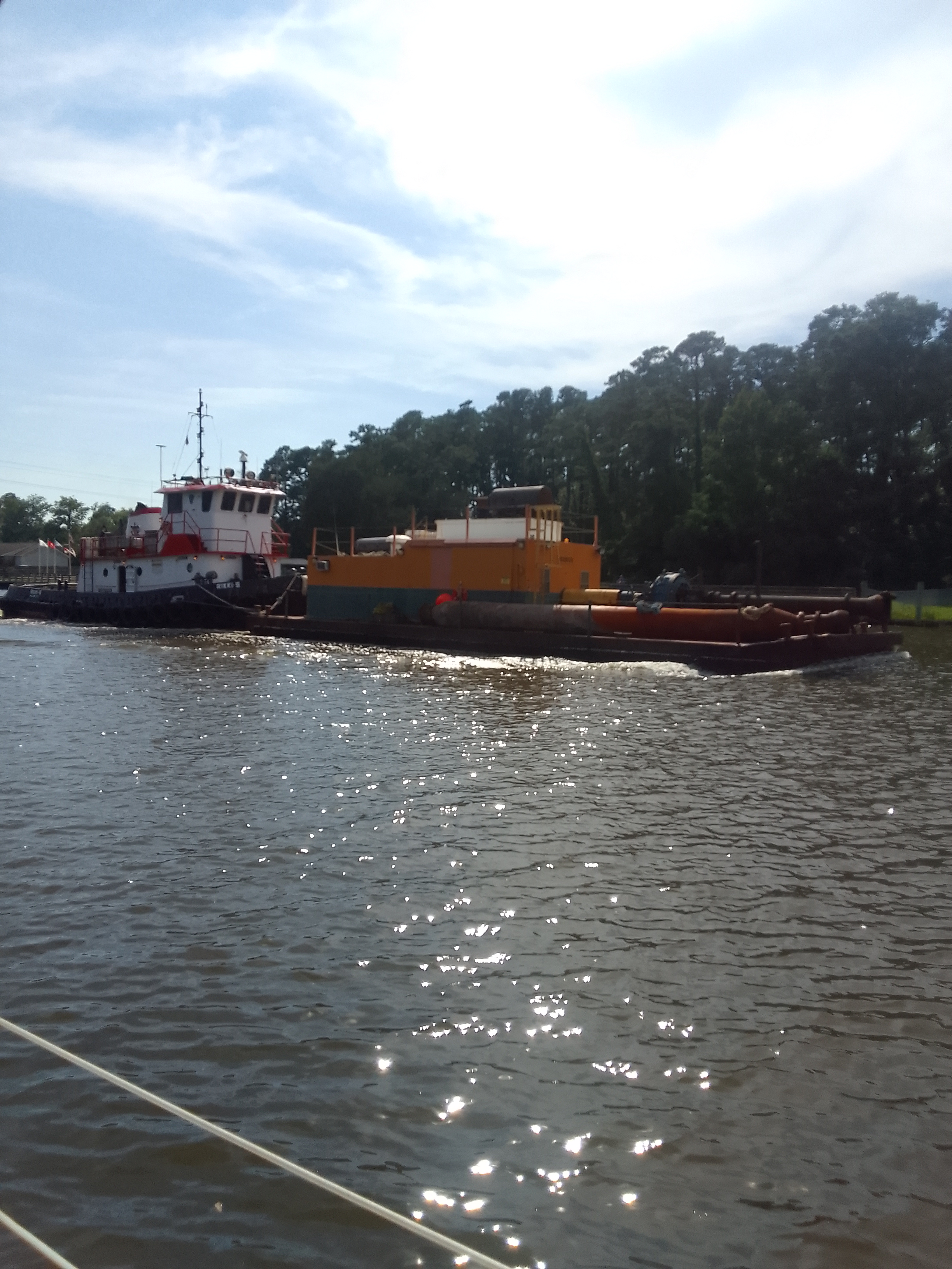 It’s a hot and hazy day with really calm water. We have a relatively short trip of about 35 miles. We’ll be in the Albermarle Sound for a bit and then in the Virginia Cut which is a narrow canal.