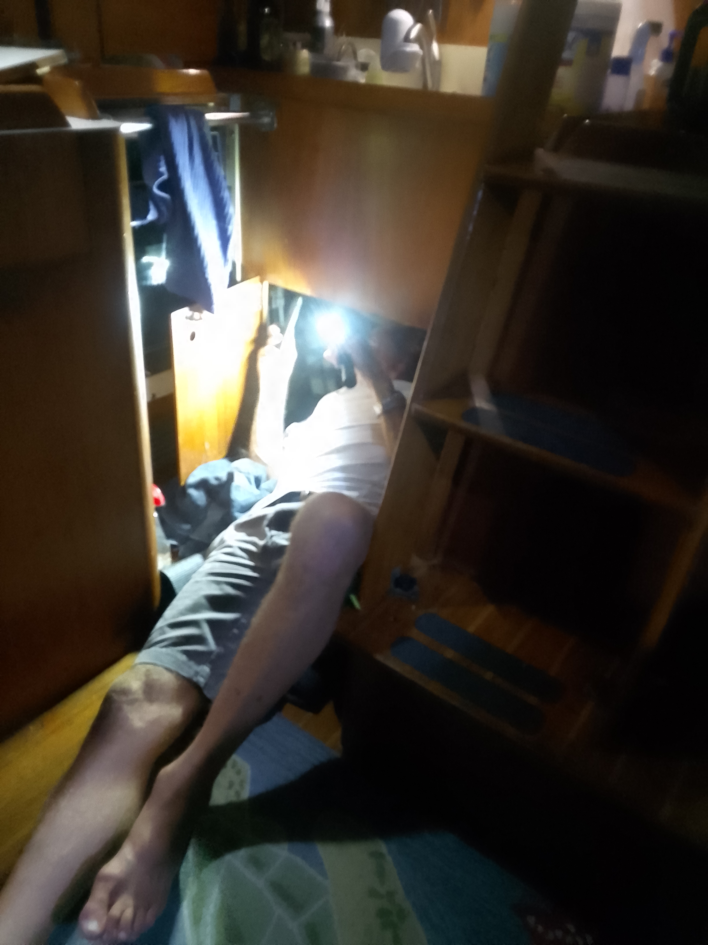 Our water pump had been running for a minute or two at night but we didn’t think much of it. When we got back on Lailia tonight, John heard a hissing noise under the galley sink. The t-connection under the sink sprung a leak and water was spraying all over.