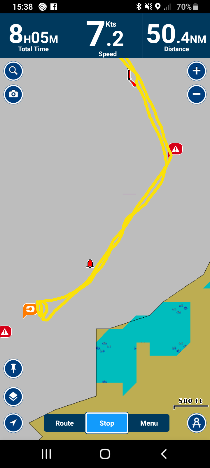 After traveling 50 miles and about 7 hours, we got to Slaughter Creek and found that the water was not deep enough for us to proceed into the marina. It’s an odd feeling to bump the bottom and try to get off. John is pretty methodical with this – when the water is getting shallow (we were using both the Garmin and channel indicators) he slows Lailia down to a crawl. We watch our depth finder carefully but there’s that moment when we bump to a stop, no matter how gentle, that just feels awful. John backed up and moved around to try to find a way through, but we just couldn’t do it.