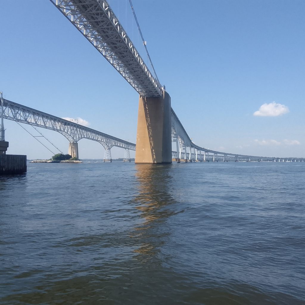 To get to this marina we had to motor under the Chesapeake Bay Bridge; fhere are two separate spans here with a single name. These spans are over four miles long and really high – we did not have to wait for them to open!