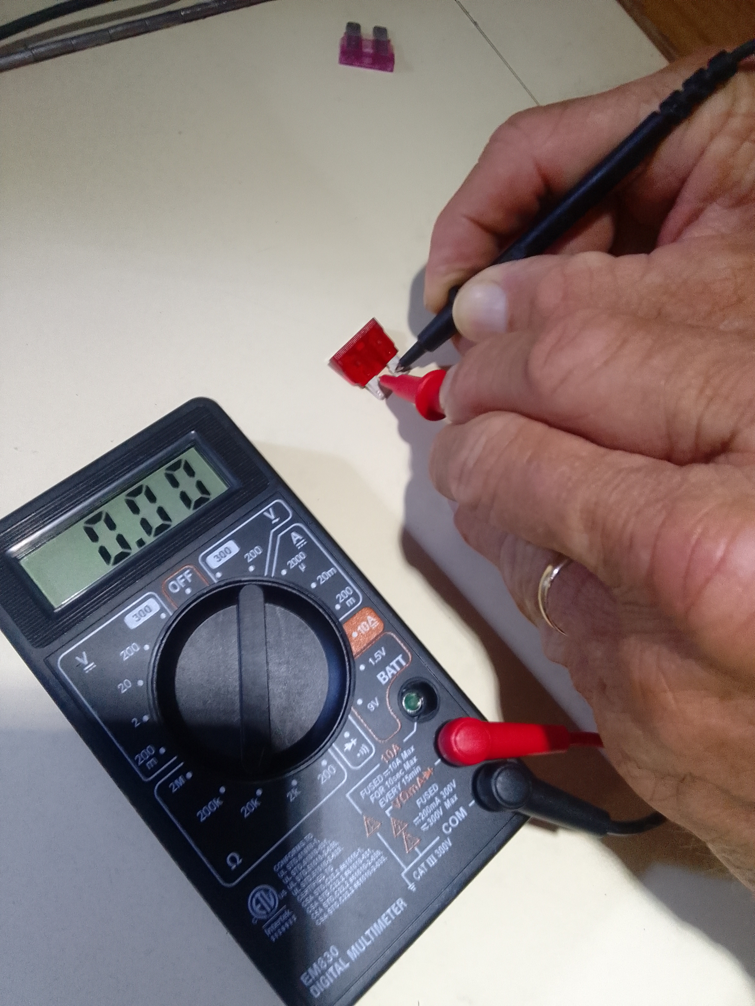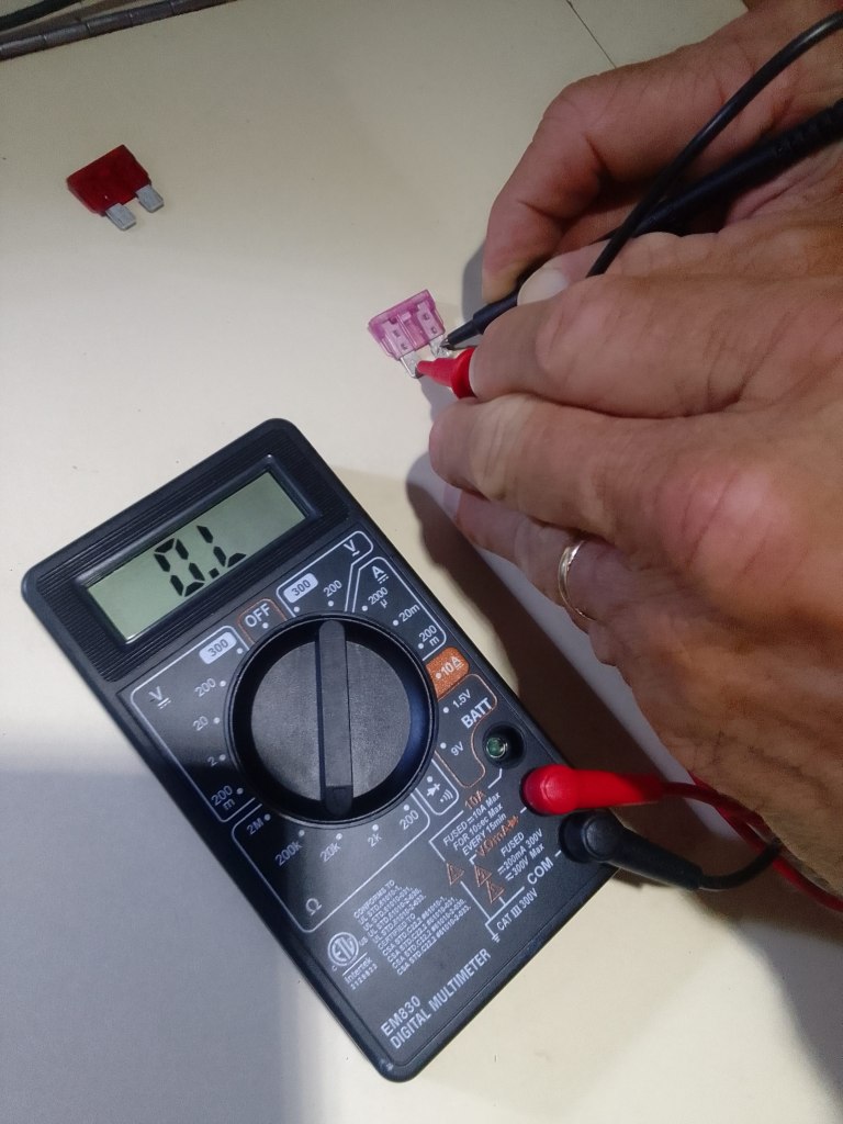 Tonight John decided to revisit the idea that our autopilot issues might be due to a bad fuse. Although he had done a visual check of the fuses in the past tonight he checked them with an ohmmeter and found that a 3 amp fuse had blown. The filament is so tiny it was difficult to see the break. The good news is that we have fuses onboard and he was able to replace it. The autopilot will still need calibration – but it works!