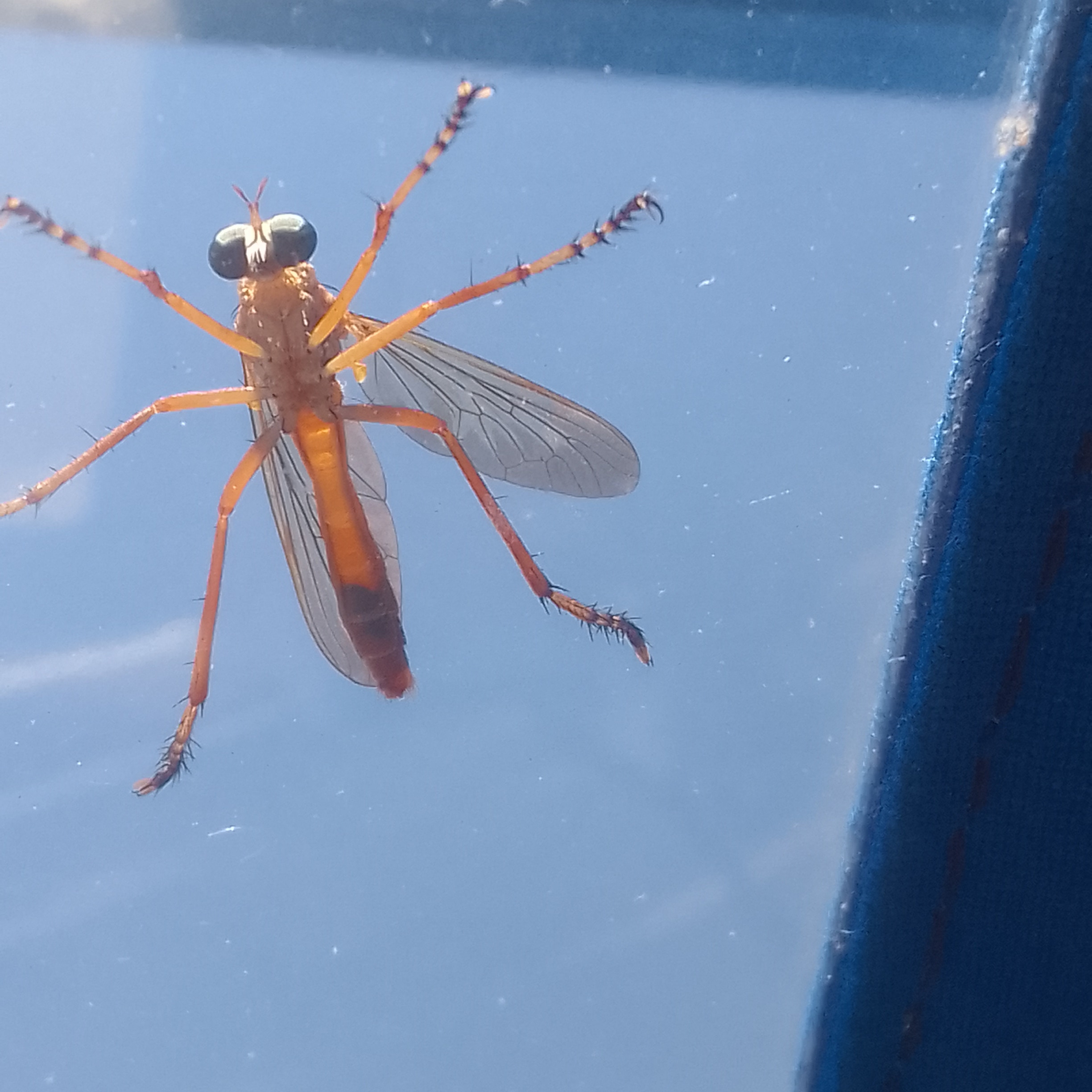 It’s a really warm and muggy day and we have been visited by another cool looking insect. My friend Samantha is a beekeeper and has identified this as a robber fly which eats other insects (unfortunately it eats bees as well as the bugs we don’t like).