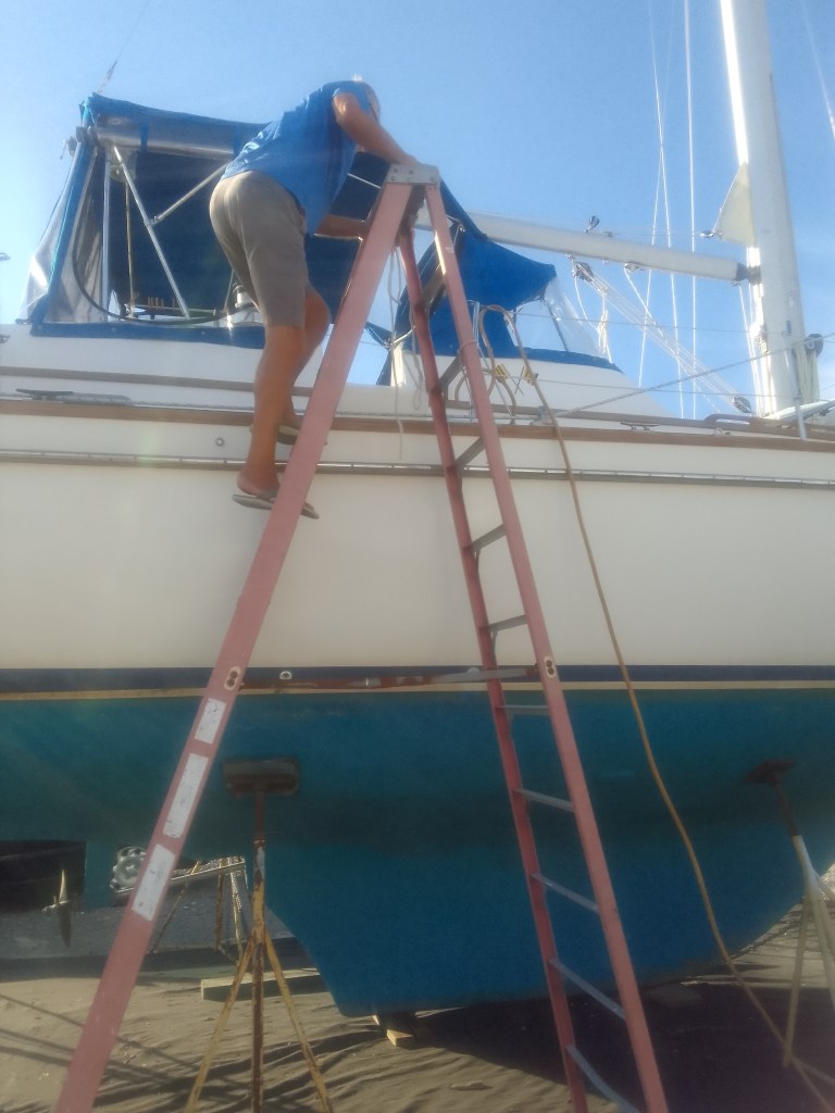Curt inspected Lailia’s hull. We have a through-hull that has to be replaced but everything else looks good. Since we had Lailia out of the water, John decided that we would get her sanded and then we would paint her hull – it’s been about three years since her last painting, so it’s time.