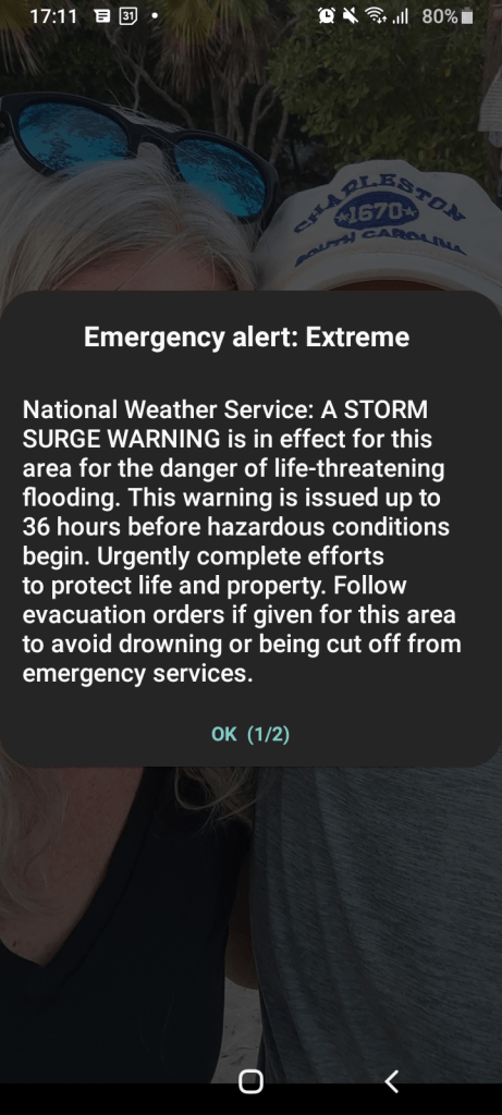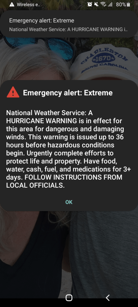 By 5:00 PM on Monday afternoon, we learned the governor was going to declare evacuations at 6:00 PM. This is when the emergency alerts began on all of our phones. We knew that we would still have time to get home, since we had a flight at about 7:00PM on Tuesday.