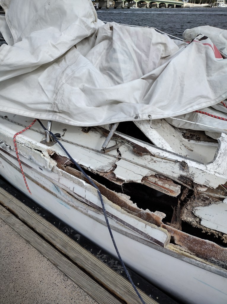 This afternoon, the sailboat was towed from the bridge; the tow driver pulled up to the marina to get fuel and to document the damage. It’s pretty sad.