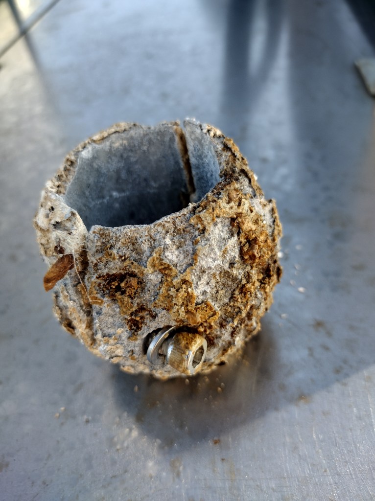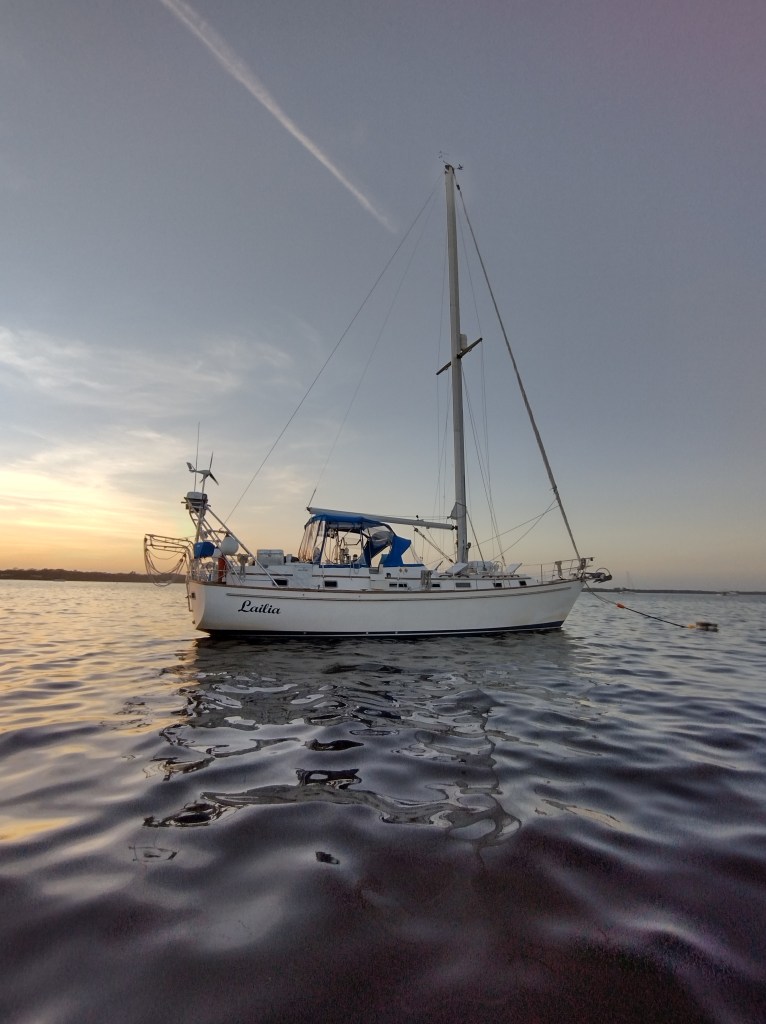 While we were in Daytona we had a diver clean Lailia’s hull and replace the sacrificial anode. Sacrificial anodes are attached to propeller shaft where they protect it from galvanic corrosion because they oxidize more easily. When we were in the fresher water of the Chesapeake, we used an aluminum anode. Since we are in salt water now, we switched to a zinc one. I think it’s cool to see how the anodes decay.