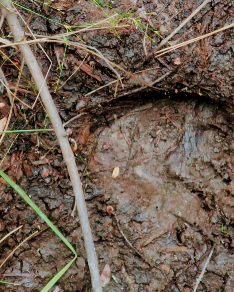 We had heard that there are bears in the area. In fact, there was an information display at Camp Helen describing what to do if a bear is encountered. I’ve been on a mission to see a bear ever since we saw the bear crossing signs at the Alligator River Marina – I still haven’t seen one, but now we have evidence that one was near.