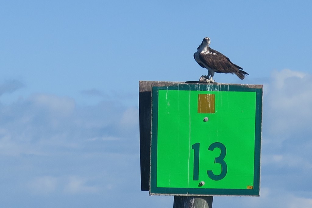 Ospreys are everywhere – on channel markers, in trees, even on a few boat masts – although we didn’t see any nests yet. In the summer almost every channel marker has a giant nest squished between the signs.