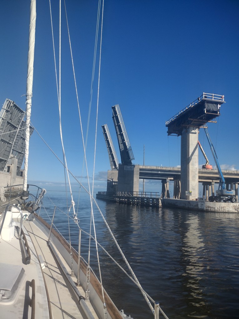 Most ICW bridges are at least 64′ from the water line and Lailia only needs 53′ to clear. At this point in our adventure, we have lost count of the number of bridges we’ve crossed under – but every now and then I have to remind myself that it’s an optical illusion that we won’t clear the bridge.
