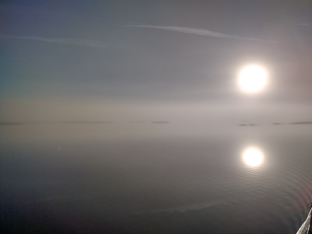 Determined to not repeat last night’s low tide escapade, we hauled anchor before 8:00 AM even though there was a bit of fog. I stood on the Lailia’s bow to look out for crab pots and any other potential hazards until the fog broke up.