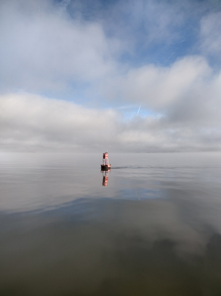 I stood on the bow to keep an eye out for crab pots and channel markers since John was using our Garmin and we could see through the fog patches.