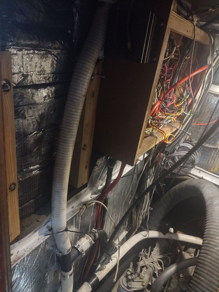 John removed our old Xantrex from our tiny engine room. The system weighs around 70 pounds and is mounted on the wall. Installing the new one is going to take a lot of finesse since it’s heavy and a little bulky.