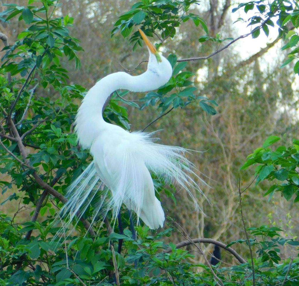 The great egrets in Cypress Wetlands are beginning their mating and nesting routines. The males have started fanning their plumage and showing off for the ladies.