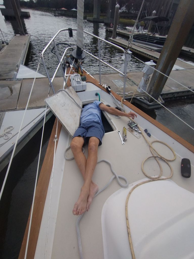 The new windlass is finicky about letting go of chain – it won’t allow an easy free fall of the anchor (our old one let us just drop it and it would fall until we manually stopped it). John will need to do some research, lots of cursing, more boat yoga, and some repair work. It does work really well getting the anchor up, though, so there’s a partial win.