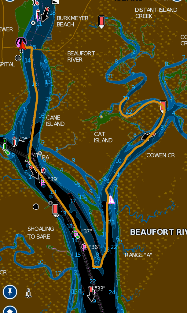 We had a short ride back to the marina this morning. The map shows how far we got into the creek’s twists.