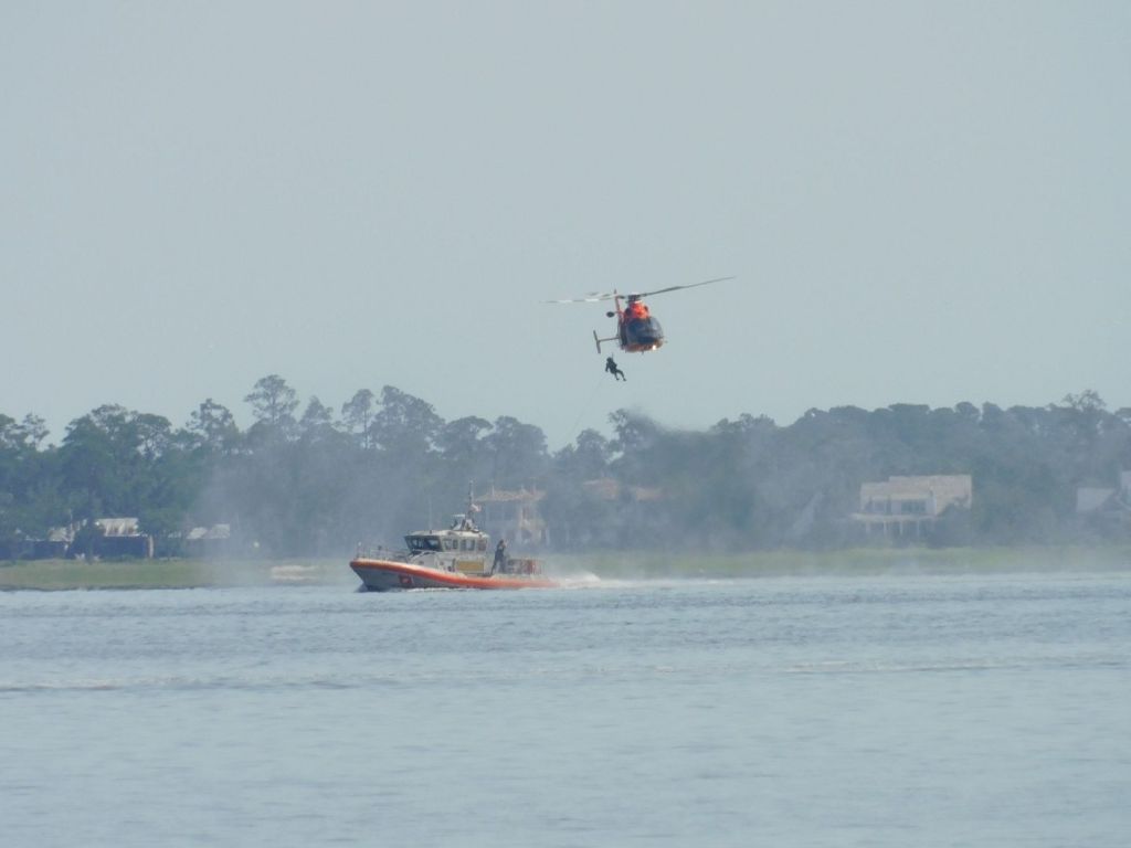 As we got closer to Brunswick we could see a Coast Guard helicopter hovering. Closer in we were able to watch the training activities of baskets and swimmers being lowered from the chopper to a Coast Guard vessel below it. These are some precision activities – the helicopter seemed to stay in place throughout the entire activity.