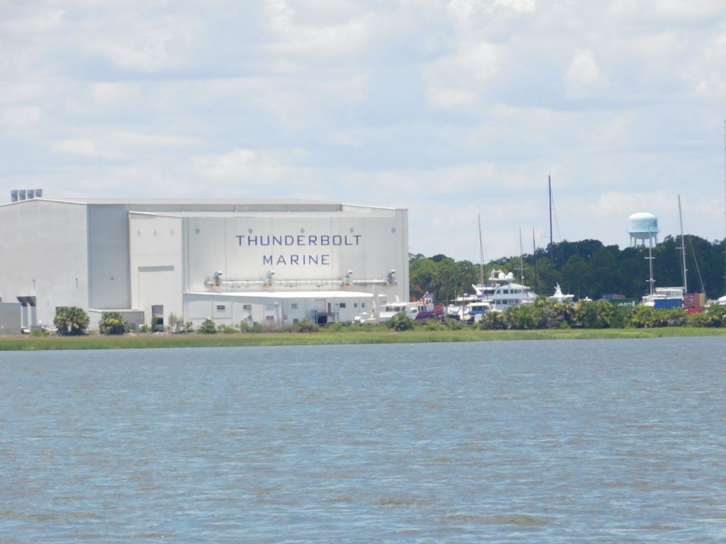 Almost exactly three years ago we docked at Thunderbolt Marina while we waited for a cable to repair our autopilot. They have a huge boatyard that does repairs on huge boats – their huge boatworks building is visible from a distance and is a good landmark.